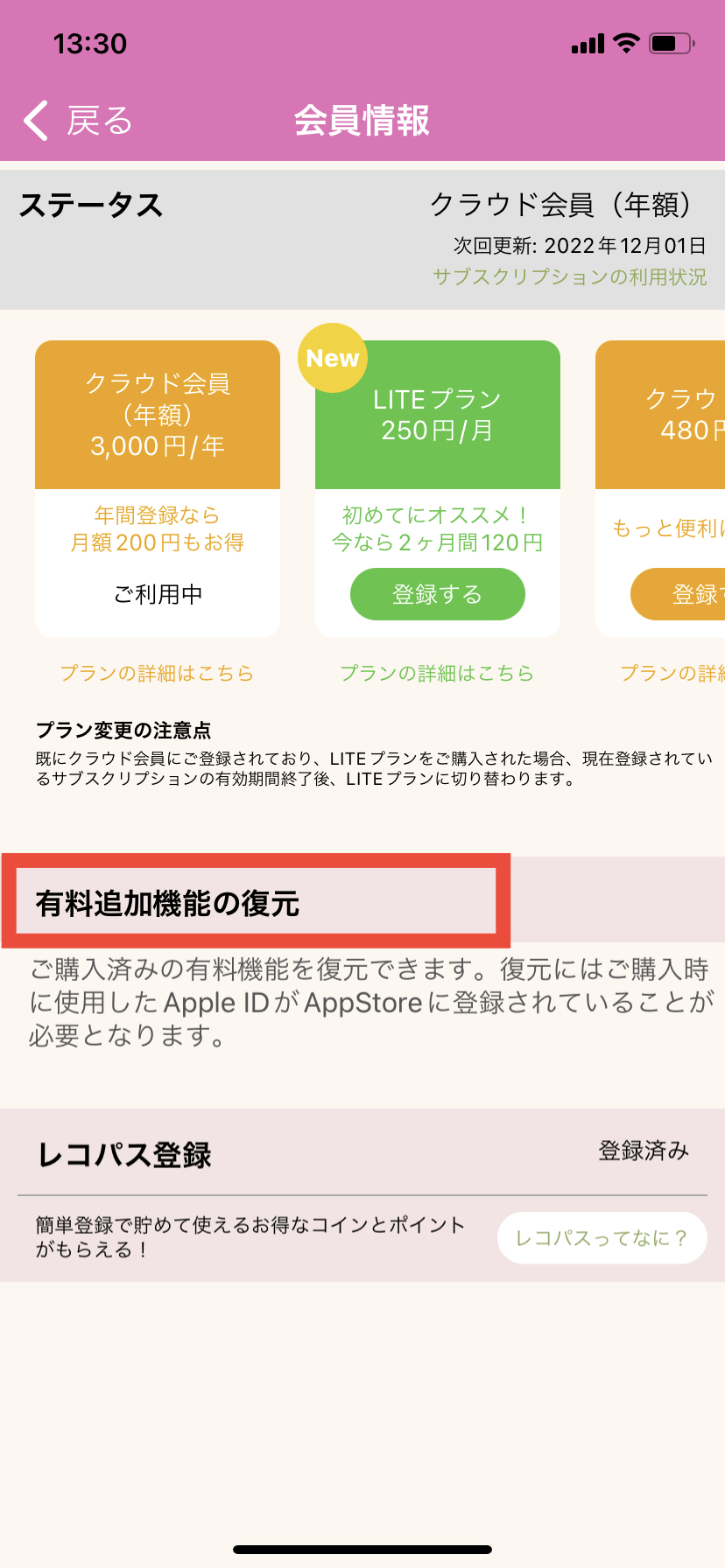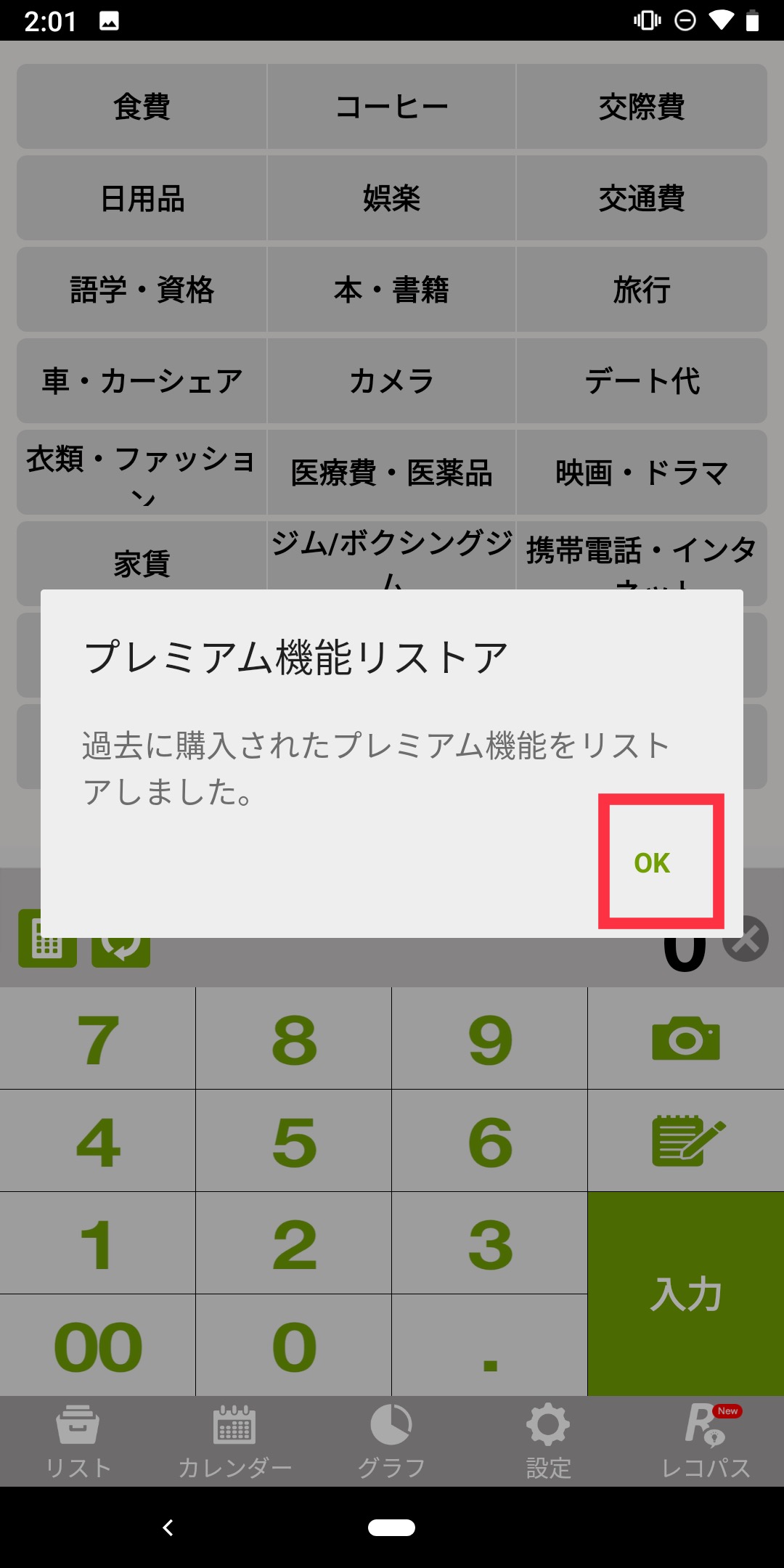 4. 「プレミアム機能リストア 過去に購入されたプレミアム機能をリストアしました」という表示がでたら「OK」を押します。