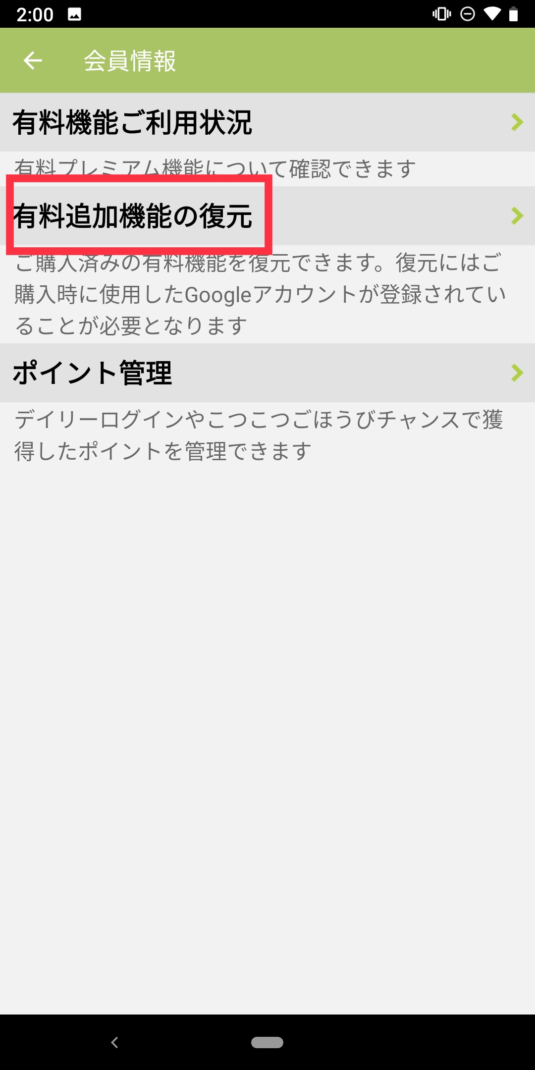 ①過去に購入した有料機能(単品購入(Android)、プレミアム・アップグレード)を引き継ぎたい