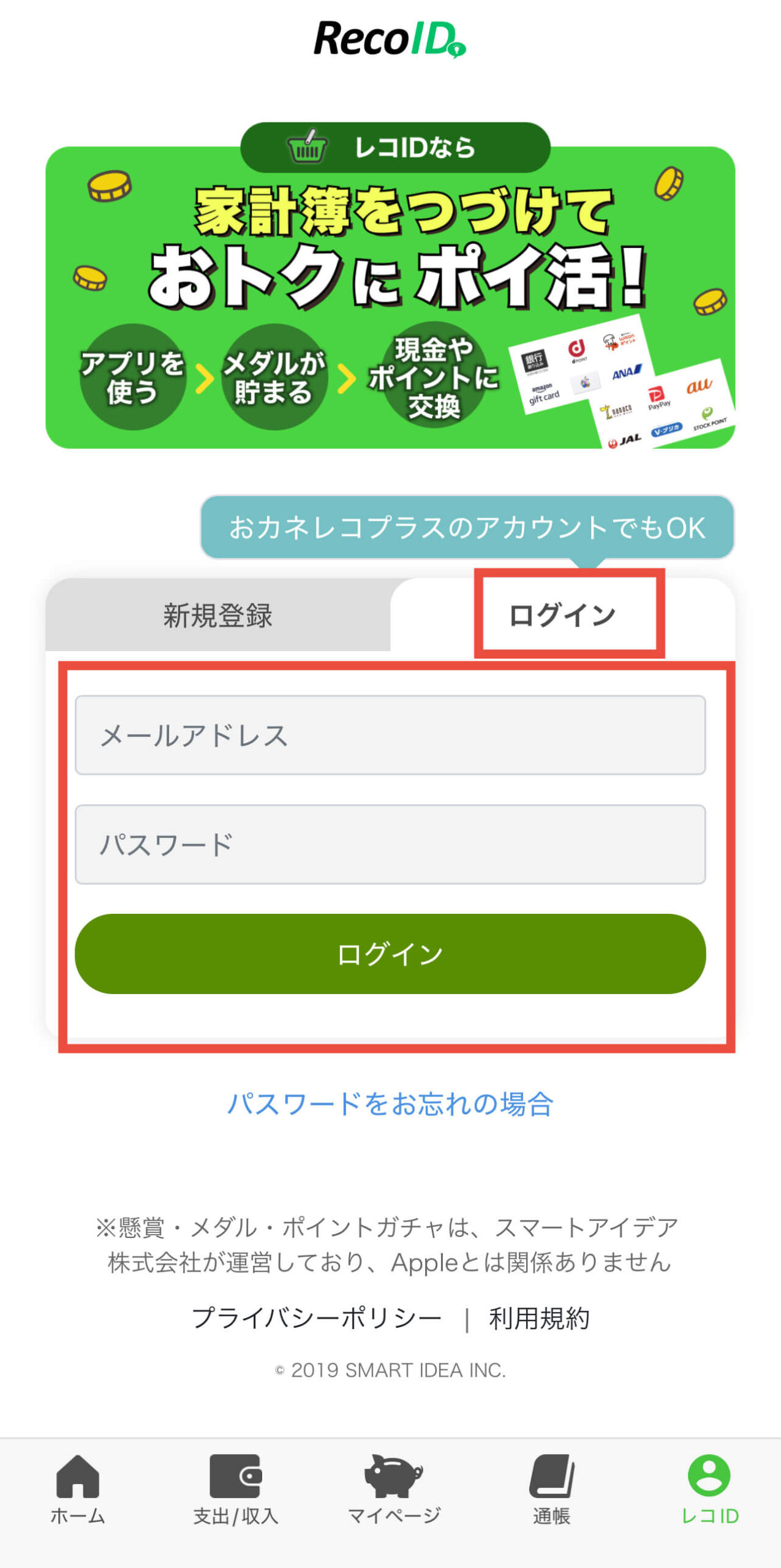 2.レコIDマイページへのログイン画面が表示されます。メールアドレスとパスワードを入力し、下部の緑色「ログイン」を押します。