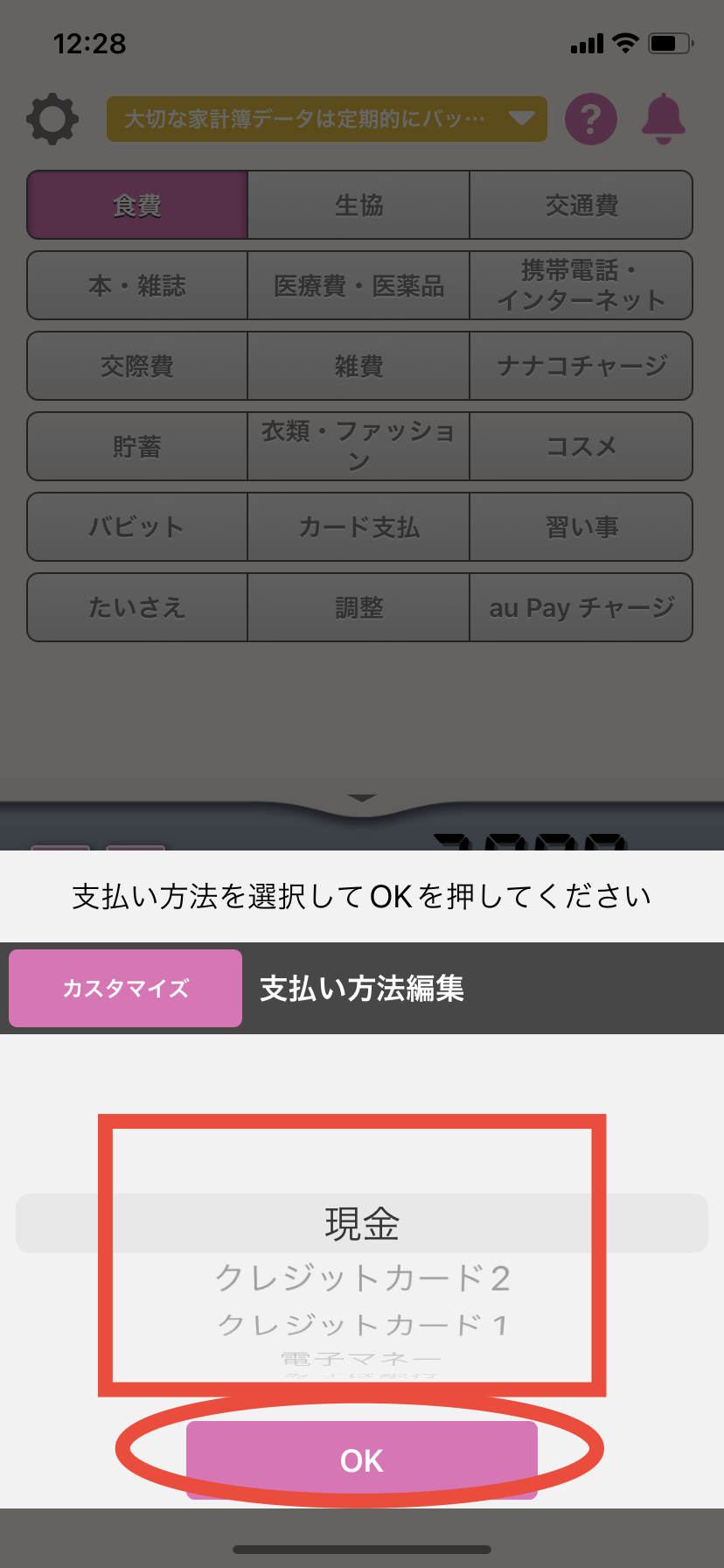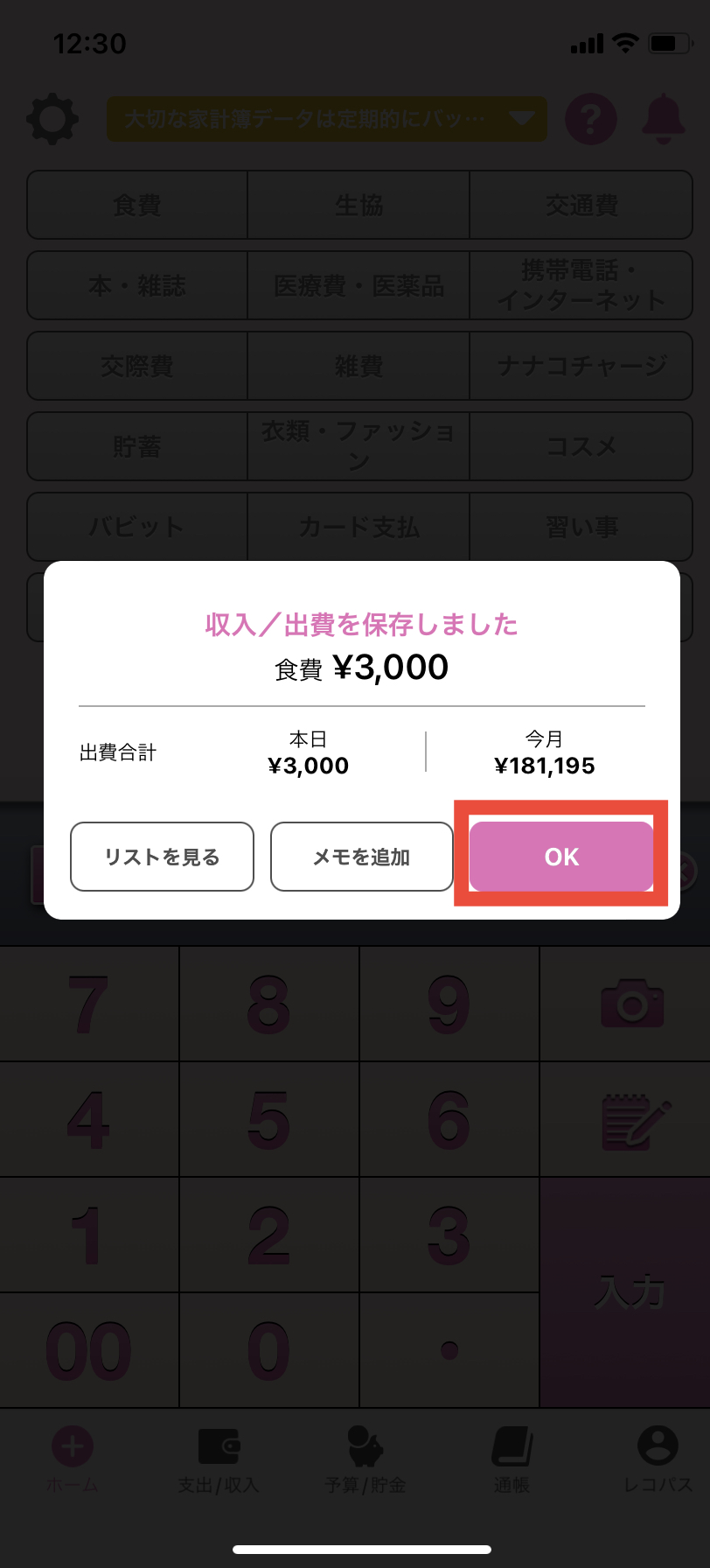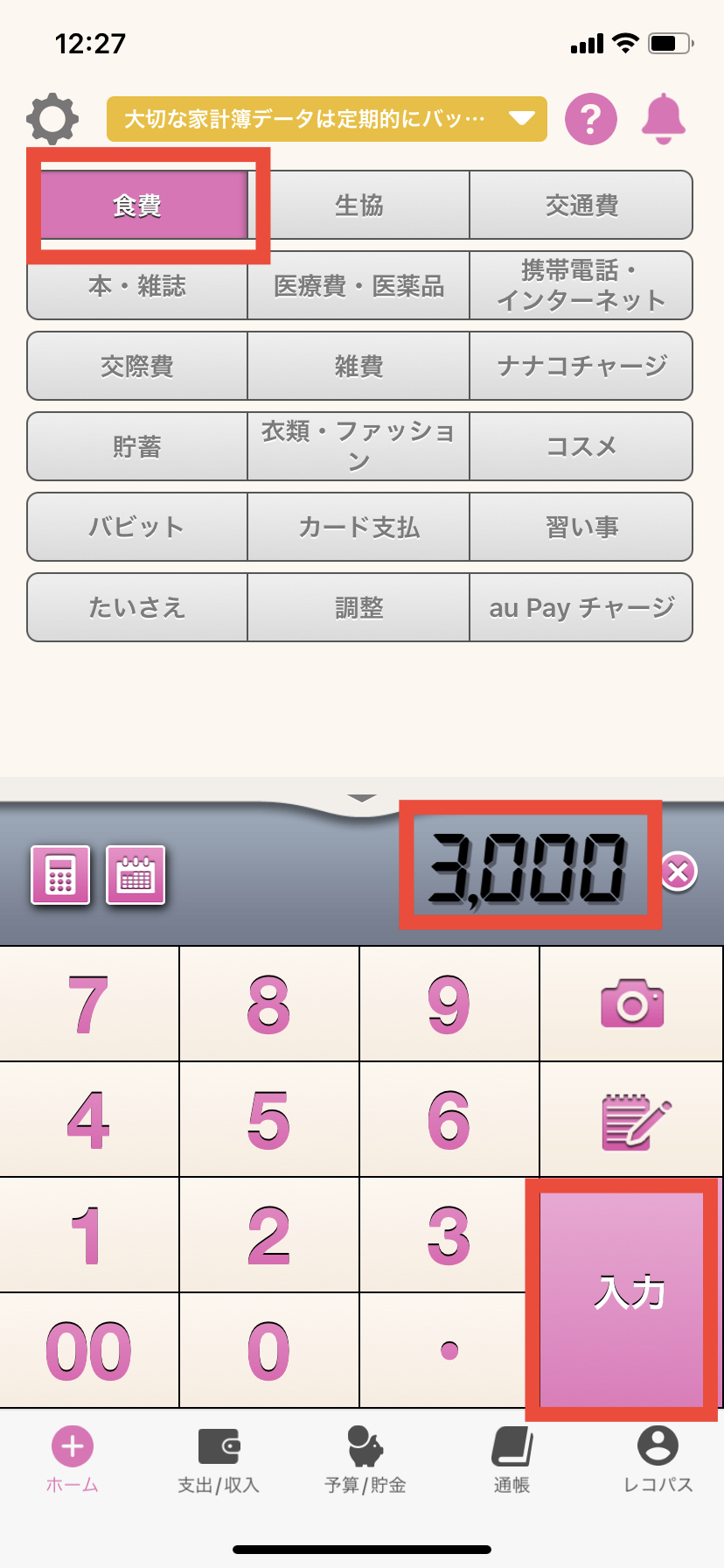 5. ホーム画面でカテゴリーを選択し、金額を入力後、「入力」ボタンを押します。