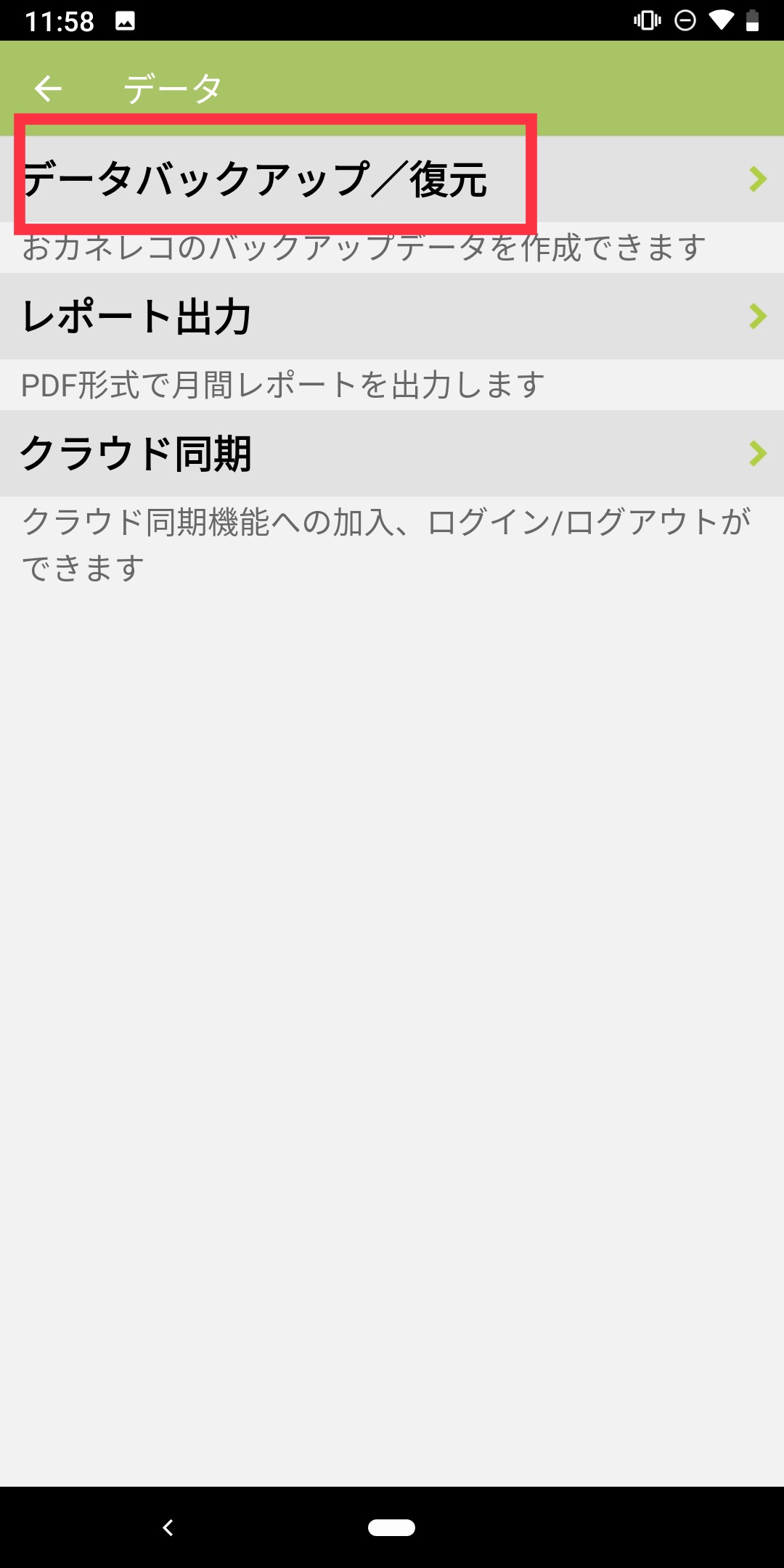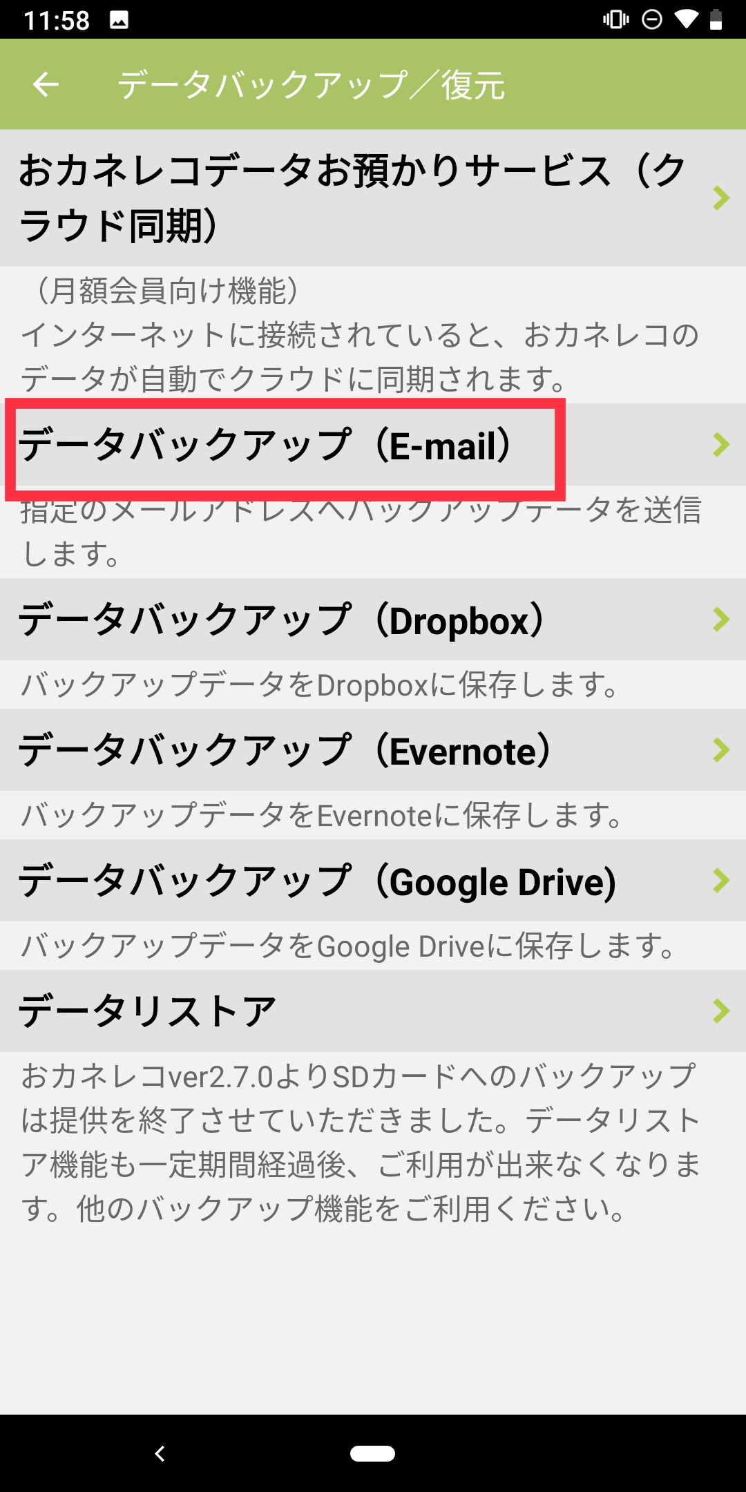 有料版おカネレコでは、E-mail以外にDropbox、Evernote、GoogleDriveへバックアップデータを保存することができます。保存したバックアップデータは同じOSのおカネレコでのみ復元が可能です。