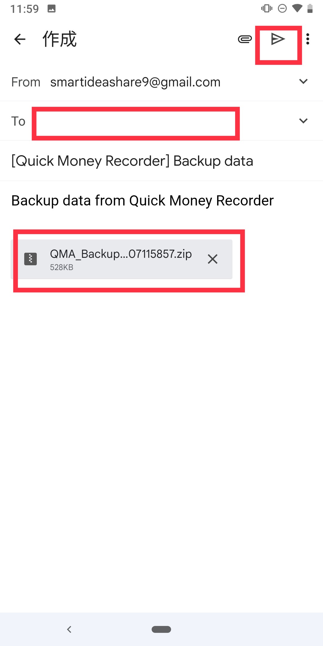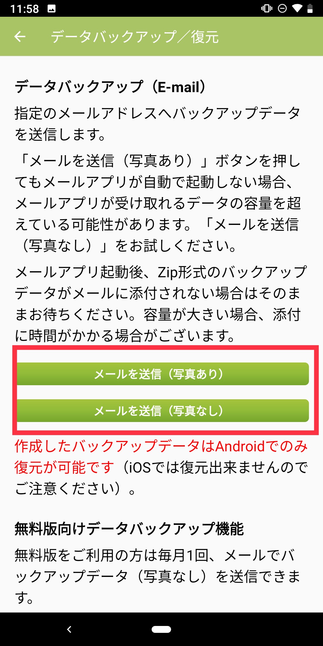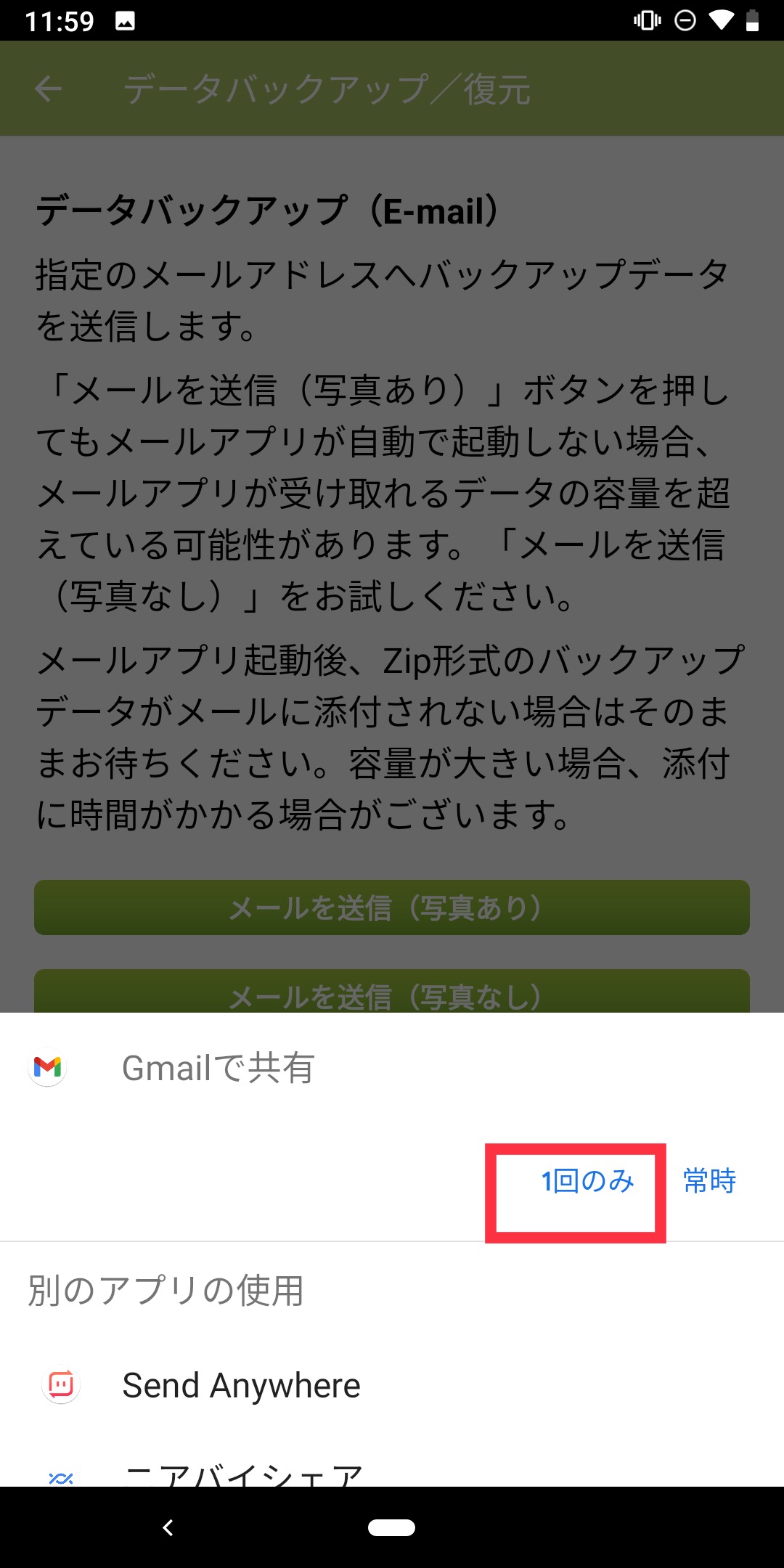 ※一部メールアプリにはバックアップの添付ファイルを引き渡すことが出来ません。