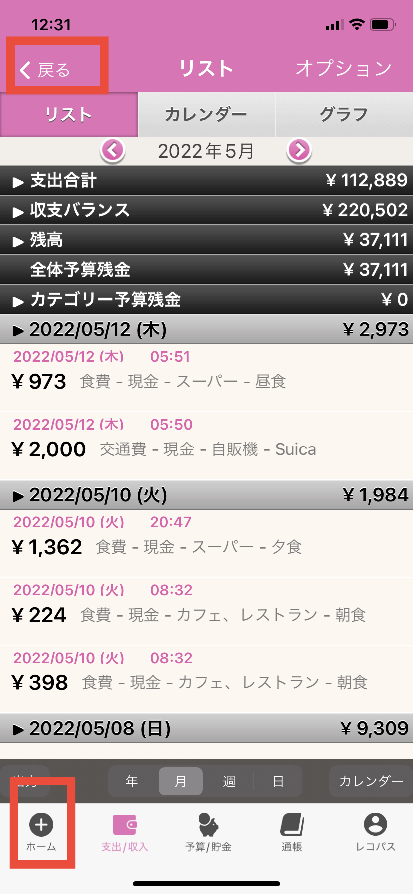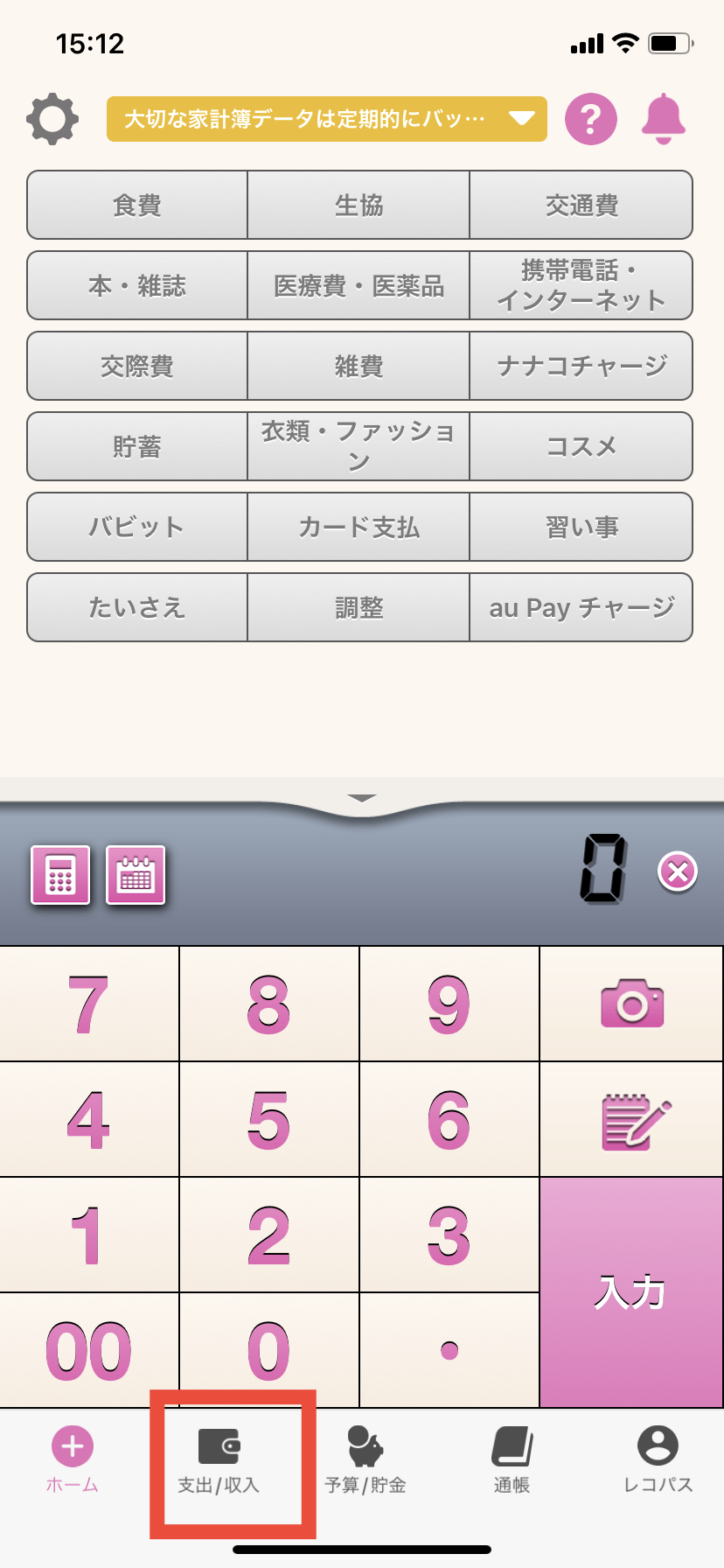 2.ホーム画面左下、「支出/収入」ボタンを押します。