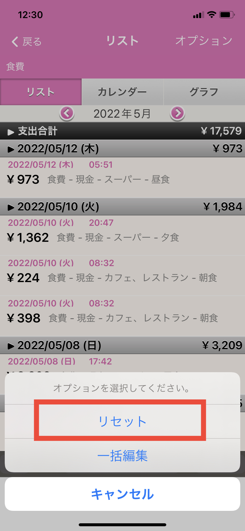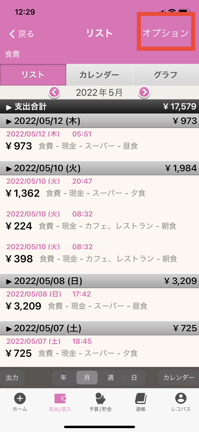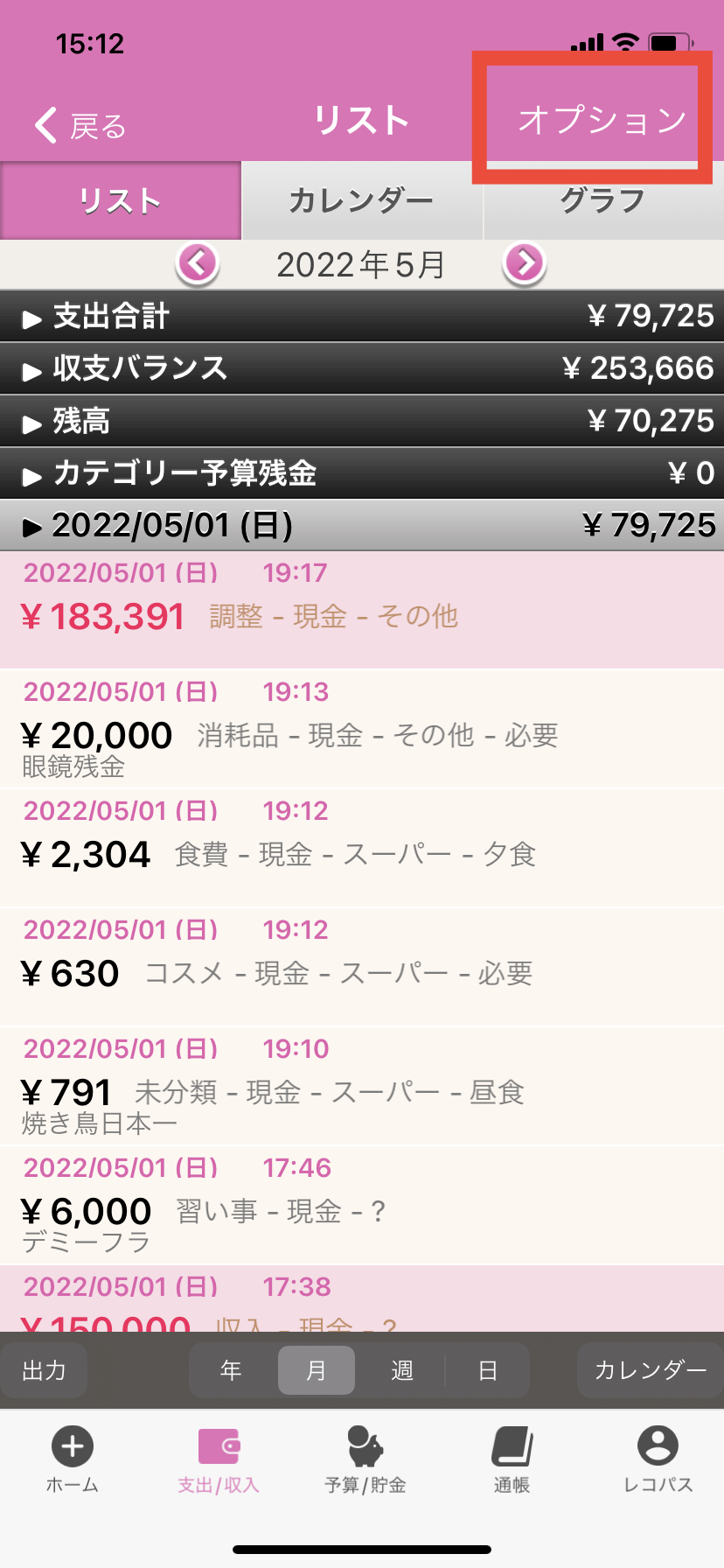 3.リスト画面が表示されますので、右上の「オプション」(グラフタブの上)を押します。
