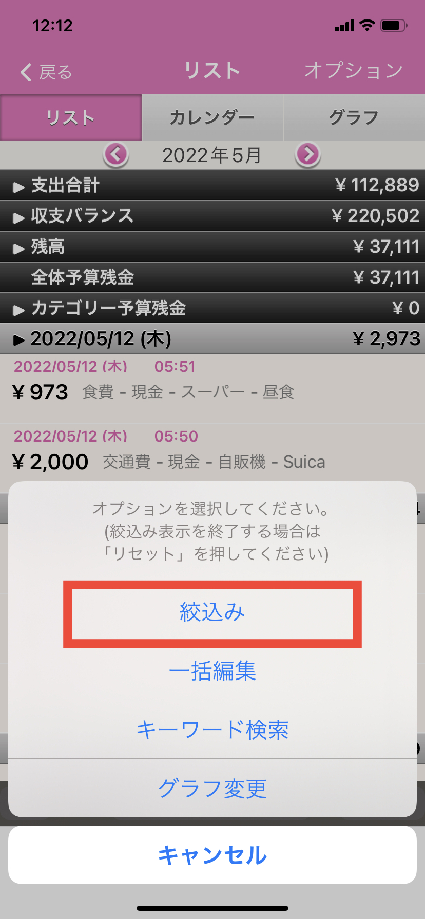 5.絞込みたい項目(カテゴリー、支払い方法、店名、ラベル)を選択します。(例:カテゴリーで絞込みます。)