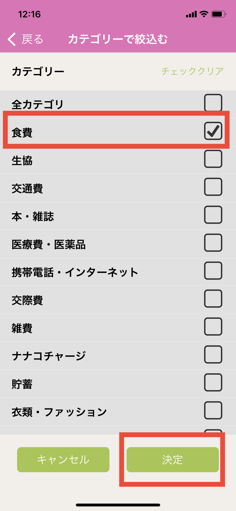 6.カテゴリーの詳細を選び(食費を例に選択)右下「決定」を押します。