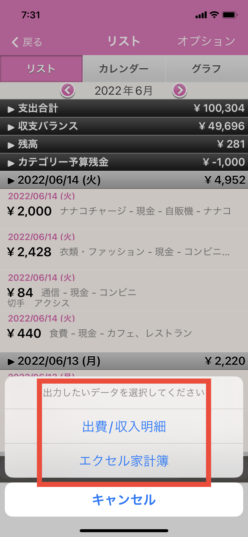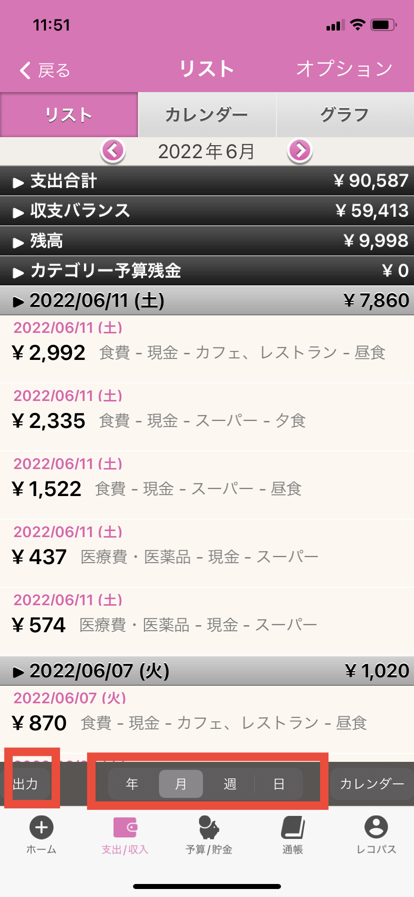 6. 出力期間で「月」を選んだ場合は、リスト内容を出力できる「出費/収入明細」か、