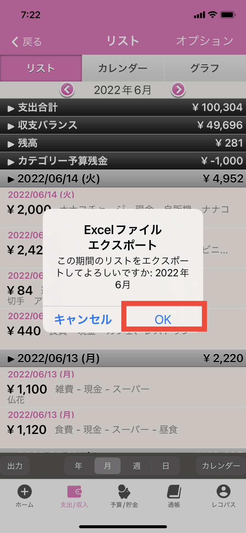 5. エクスポートの確認画面が表示されます。出力期間を確認のうえ「OK」を押します。