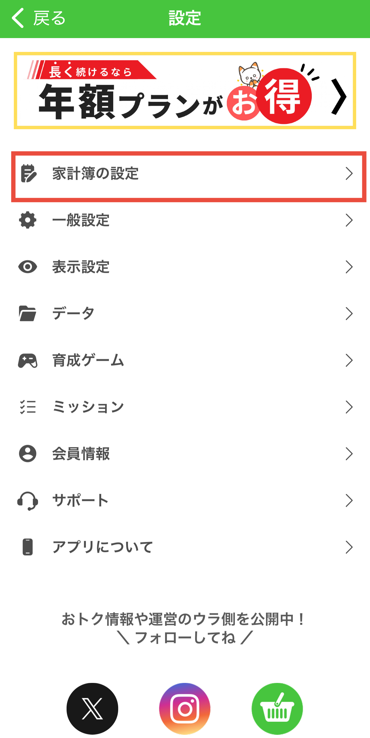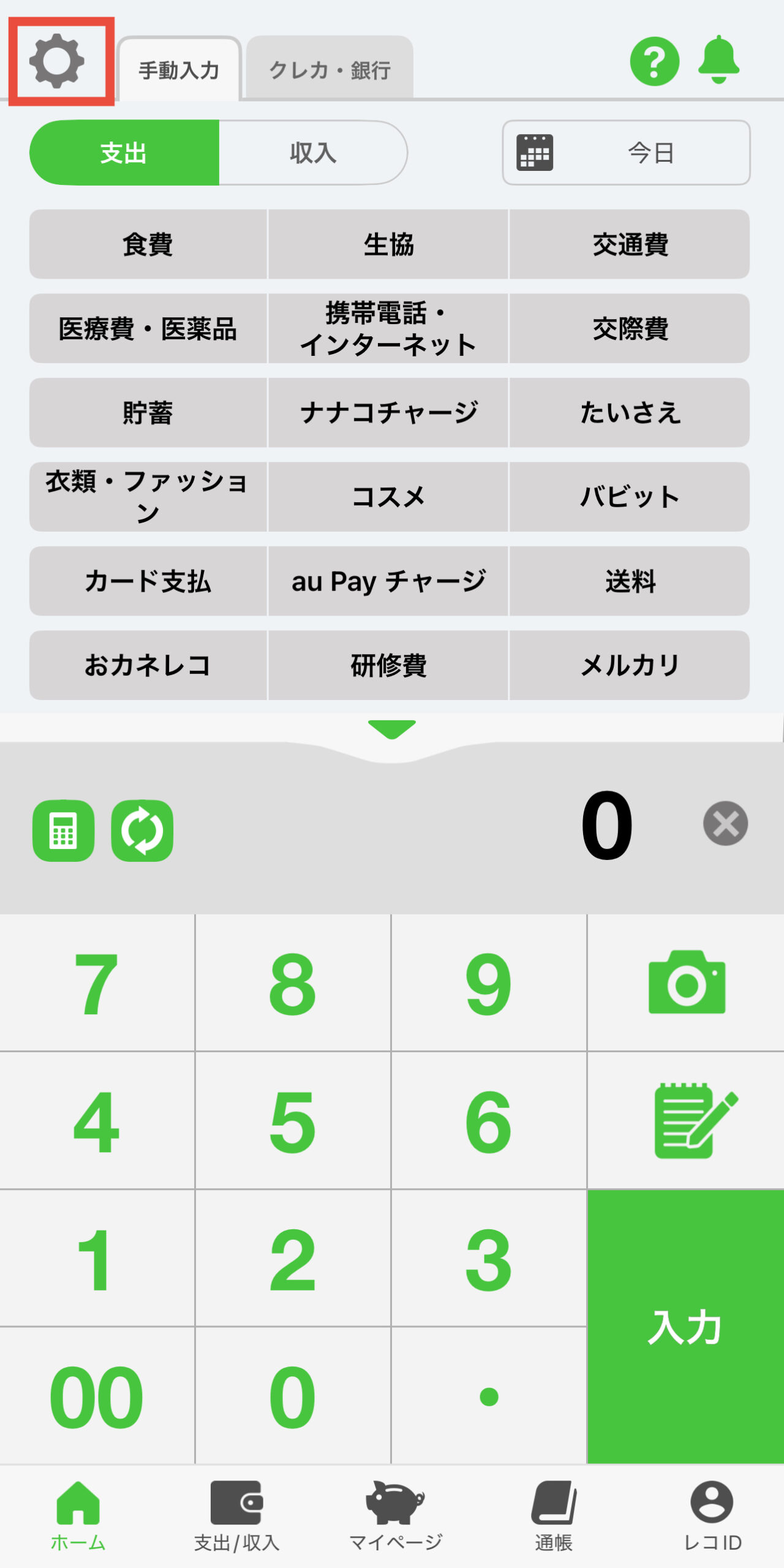 1. おカネレコを起動し、トップ画面上部の「歯車」ボタンを押します。