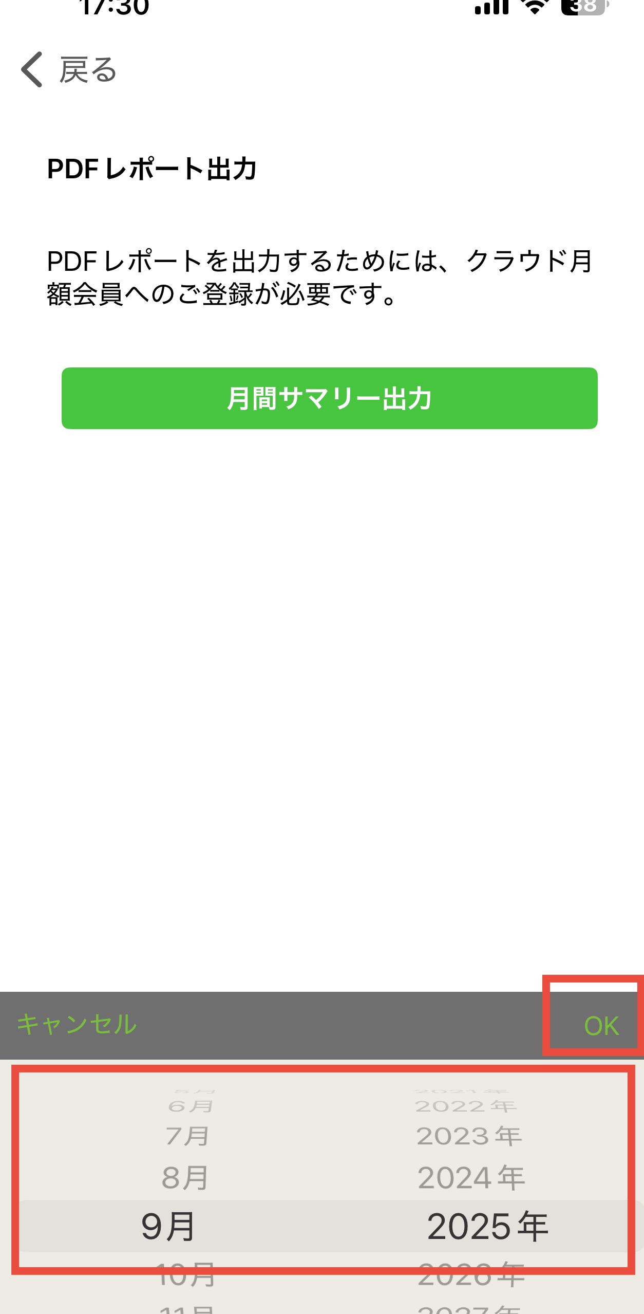 5.下部のトグルから出力したい「年」と「月」を選択し右上の「OK」を押します。