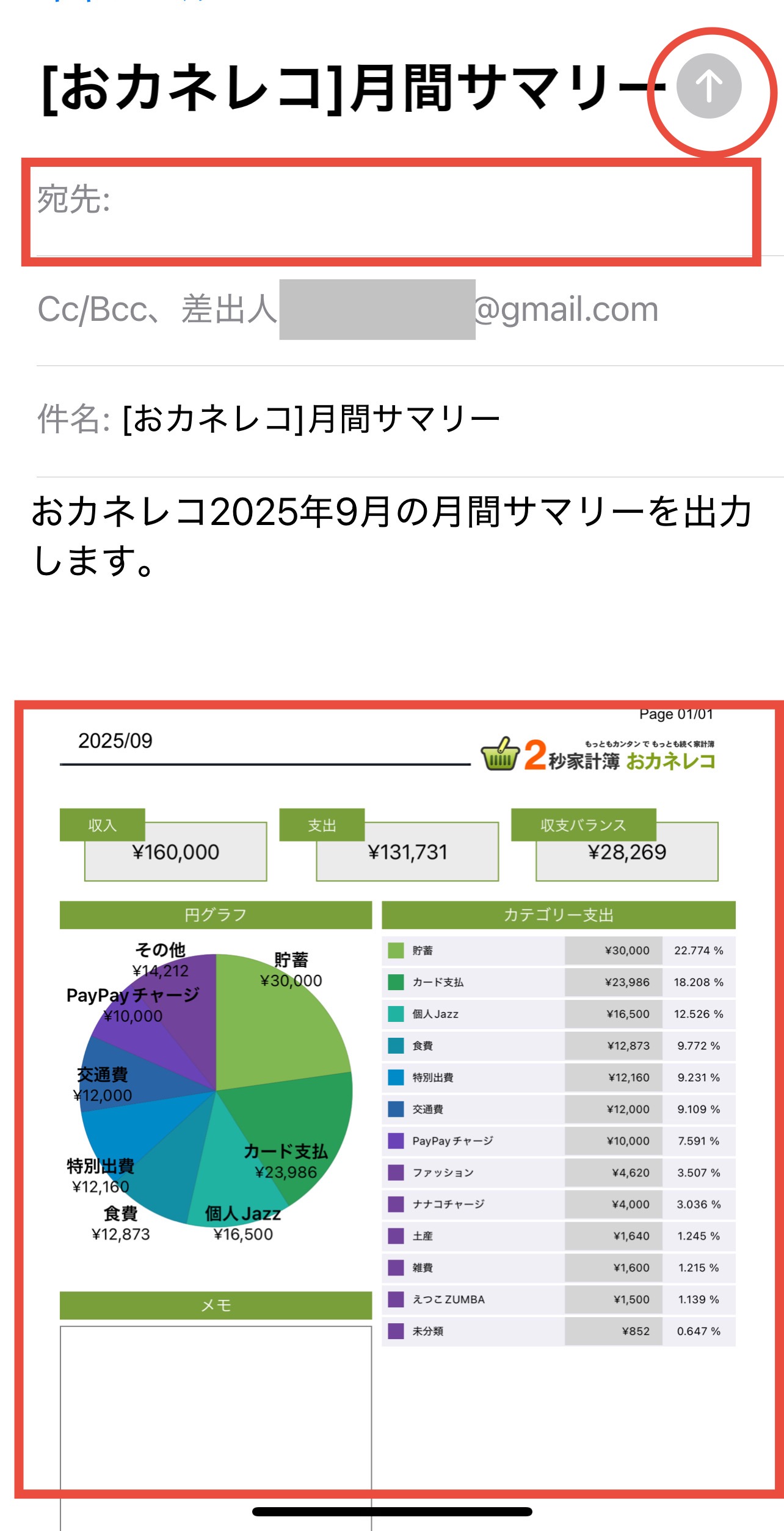 6.メーラーが立ち上がりますので、送りたいメールの宛先を入力して右上丸付き上向き矢印「↑」を押してメールを送信します。下記のようなPDFが送信されます。