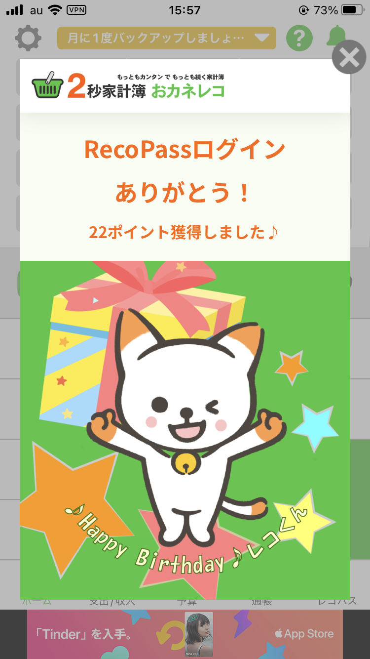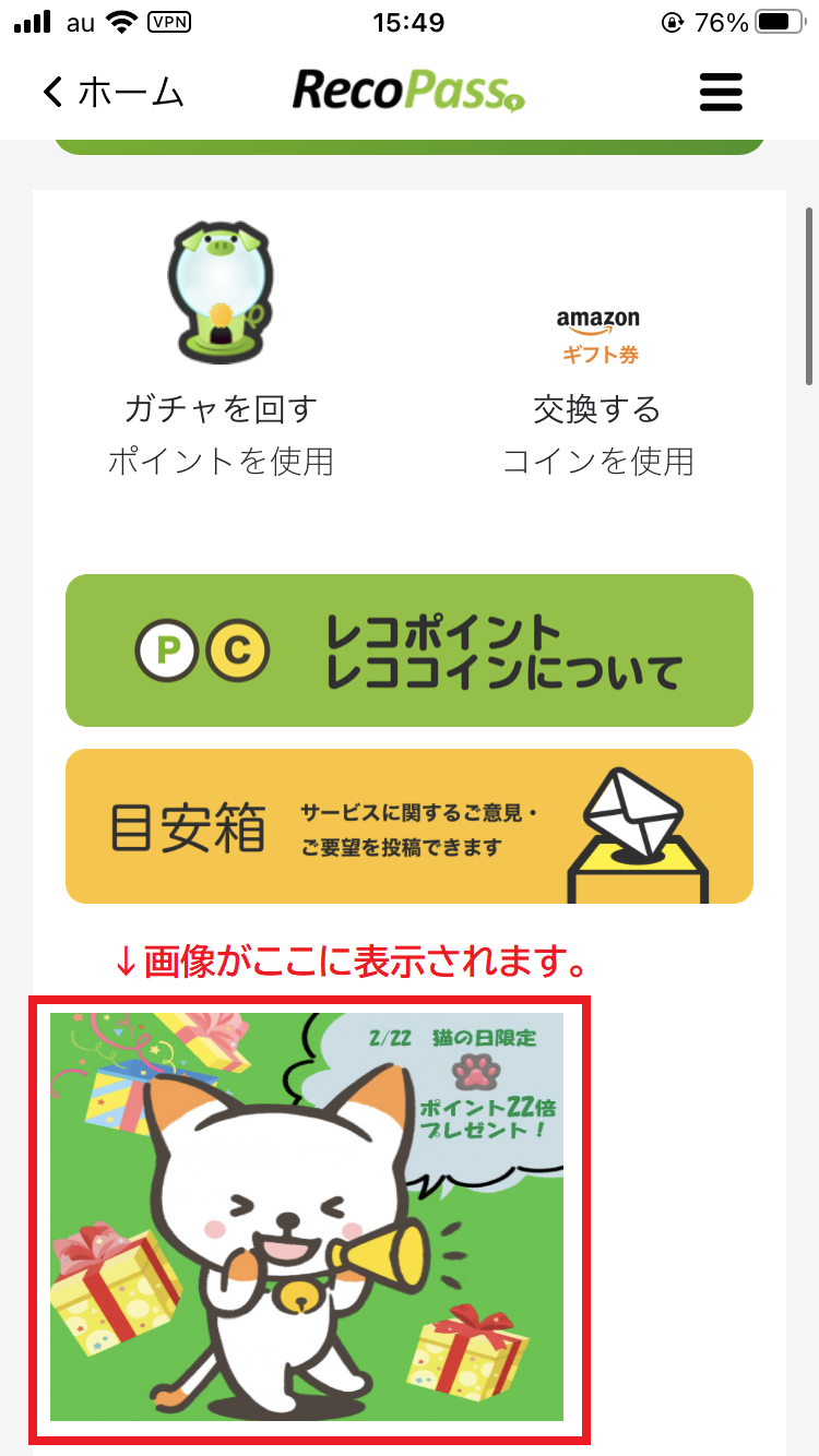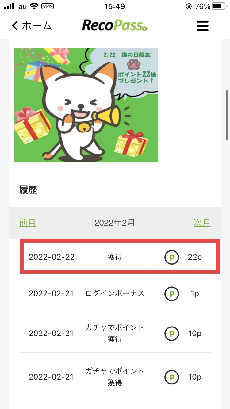 3.画像を押していただくと、レコポイント獲得画面が表示されます。