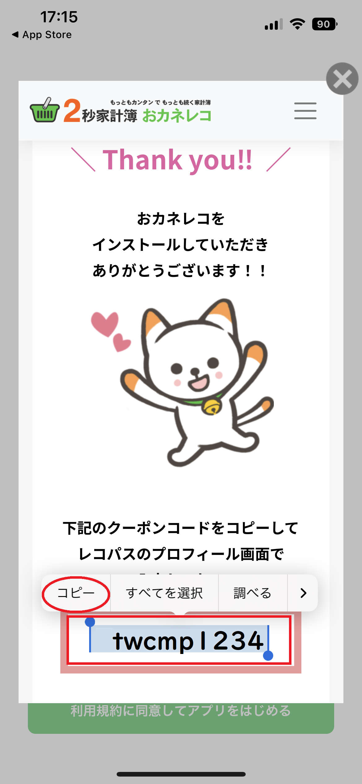 2.クーポンコードの画面が表示されましたら、クーポンコードの箇所を長押しし、コードをコピーします。