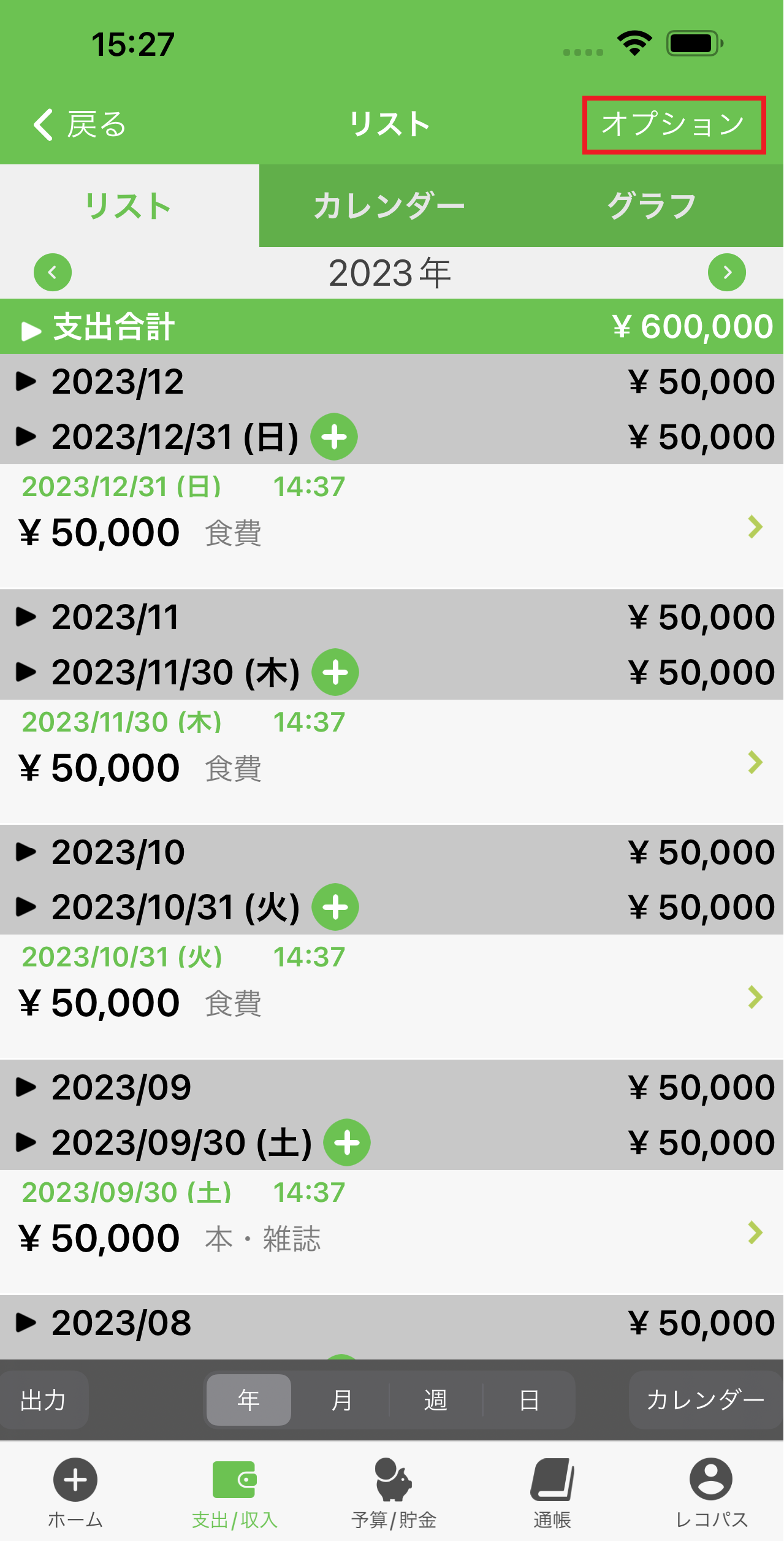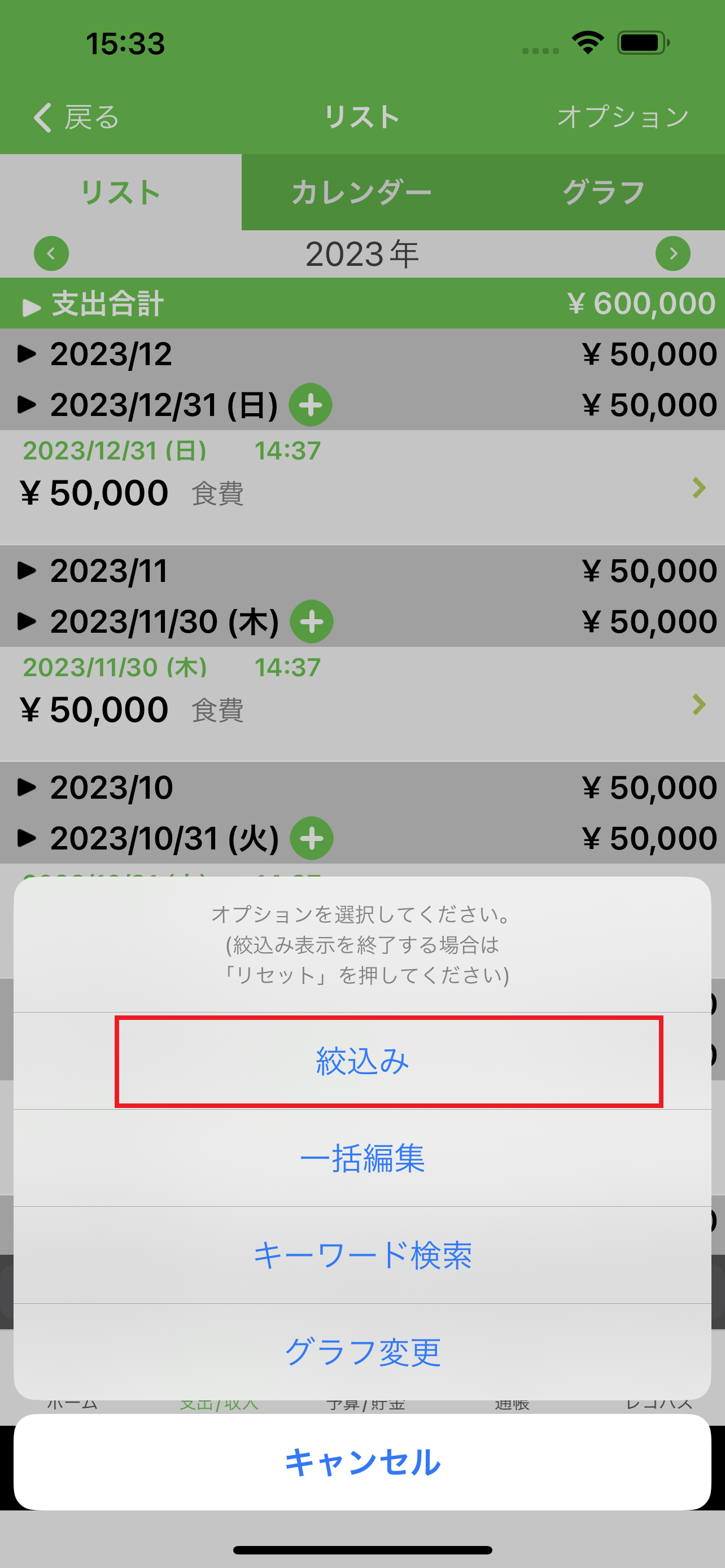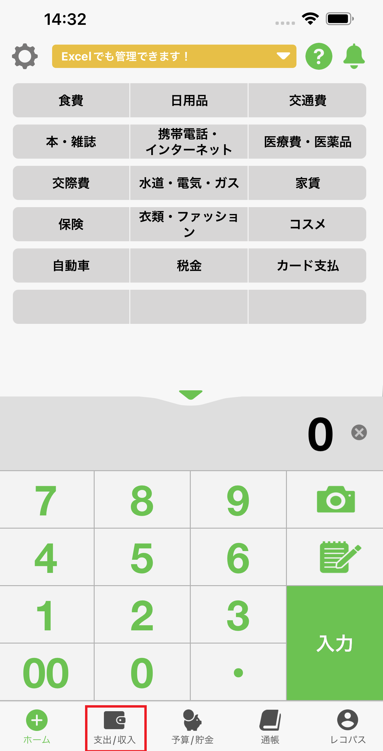 1.ホーム画面の下にある「支出/収入」のアイコンを押します。