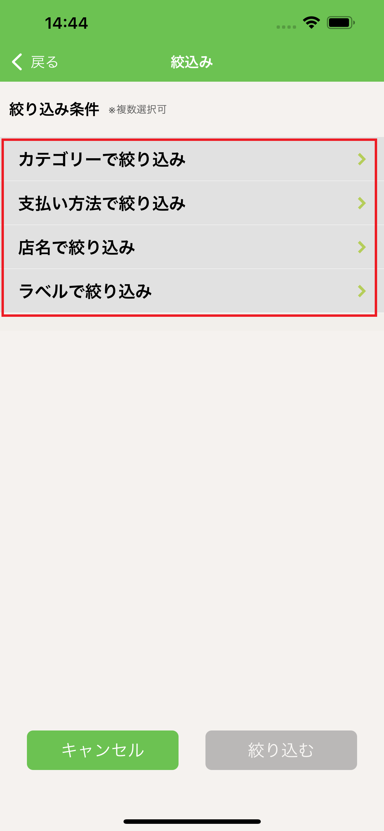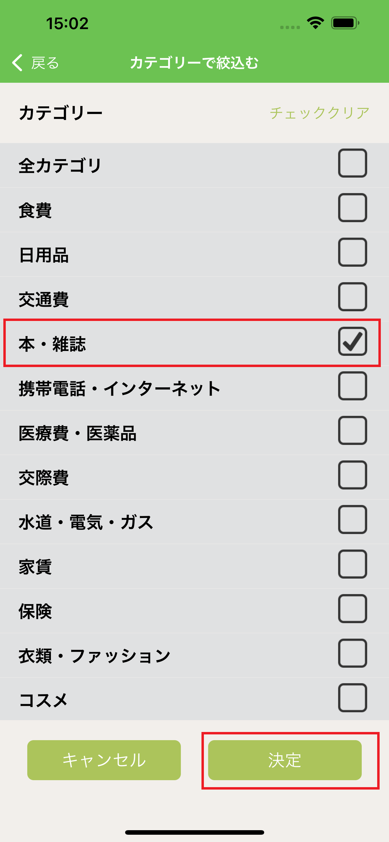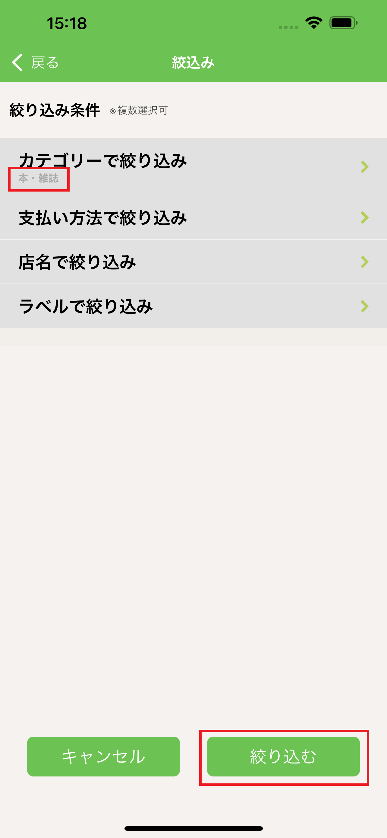 5.絞り込みたいカテゴリーを選択して、下の決定ボタンを押します。(今回は「カテゴリーで絞り込み」を選択しています。)