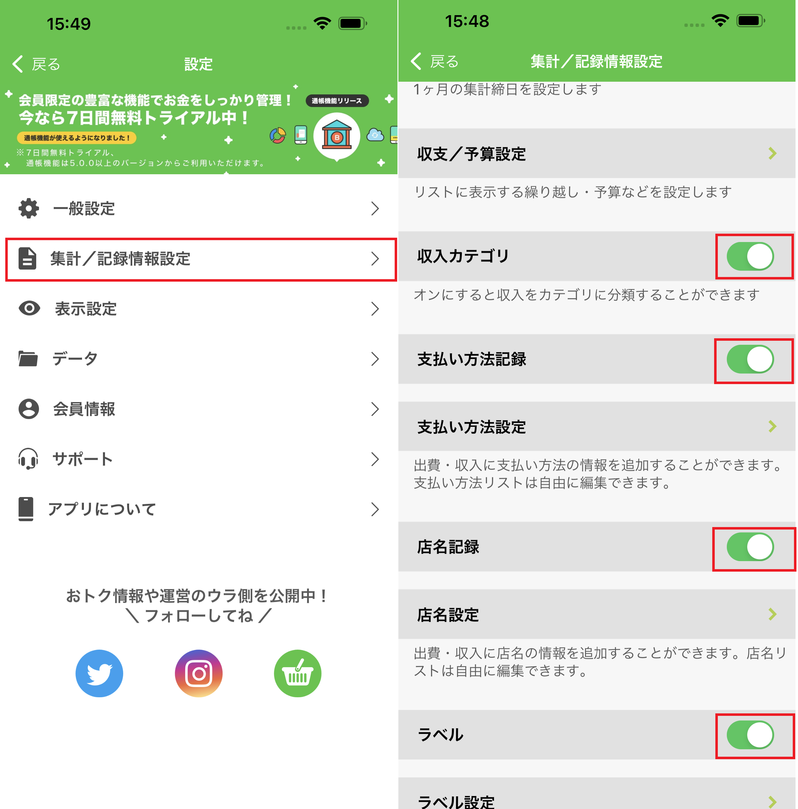 ※設定の「集計/記録情報設定」にある各項目を設定ONにしてから「絞り込む」機能をご利用ください。