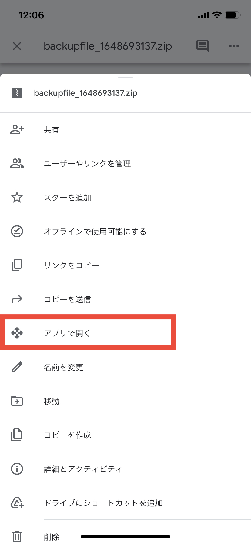 バックアップデータの復元は『上書き復元』となります。バックアップデータと現在のアプリに差分がある場合、差分のデータは消失しますのでご注意ください。誤って空のZipファイルを復元した場合は現在のデータも全て消えてしまいますのでご注意ください。