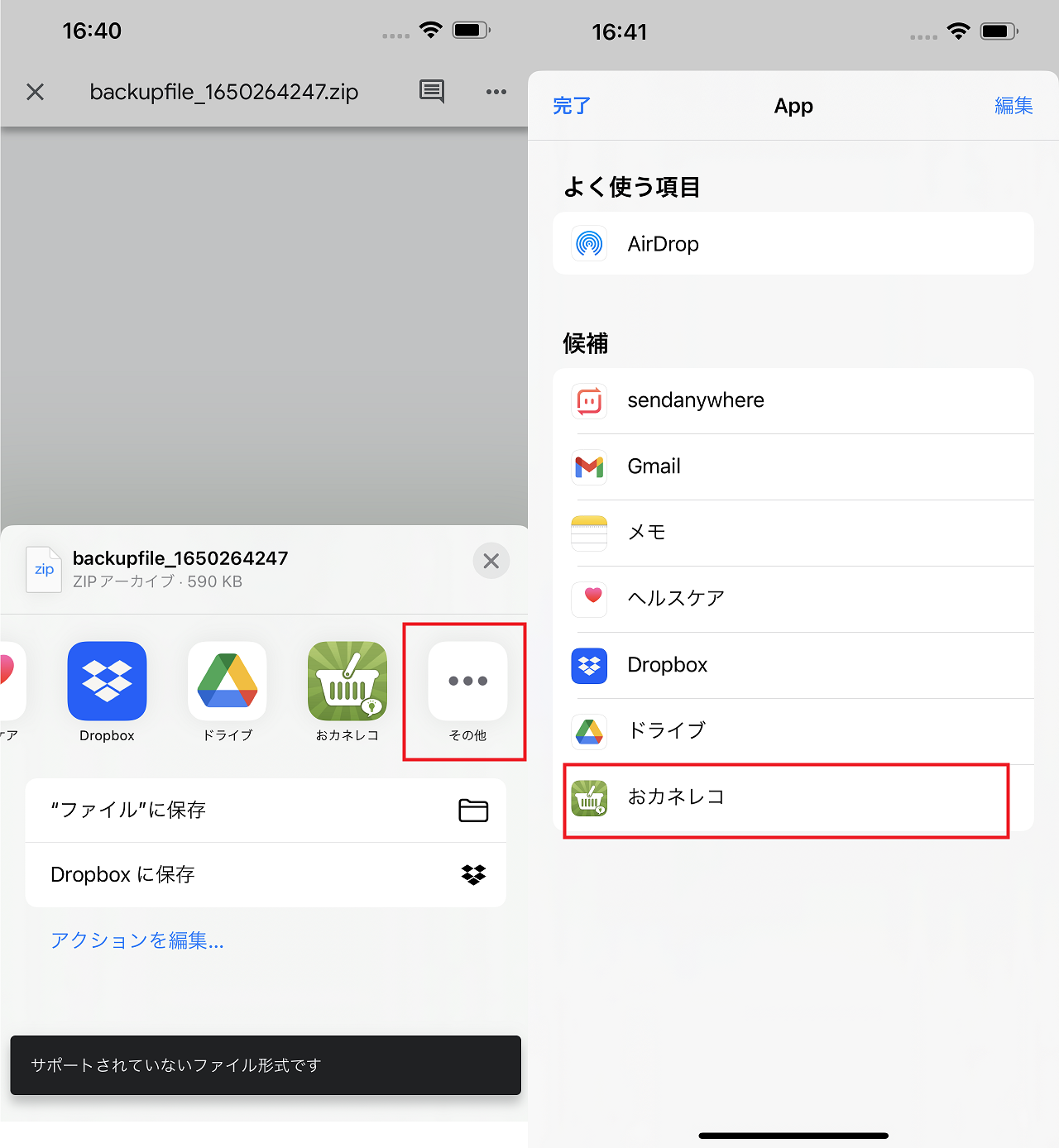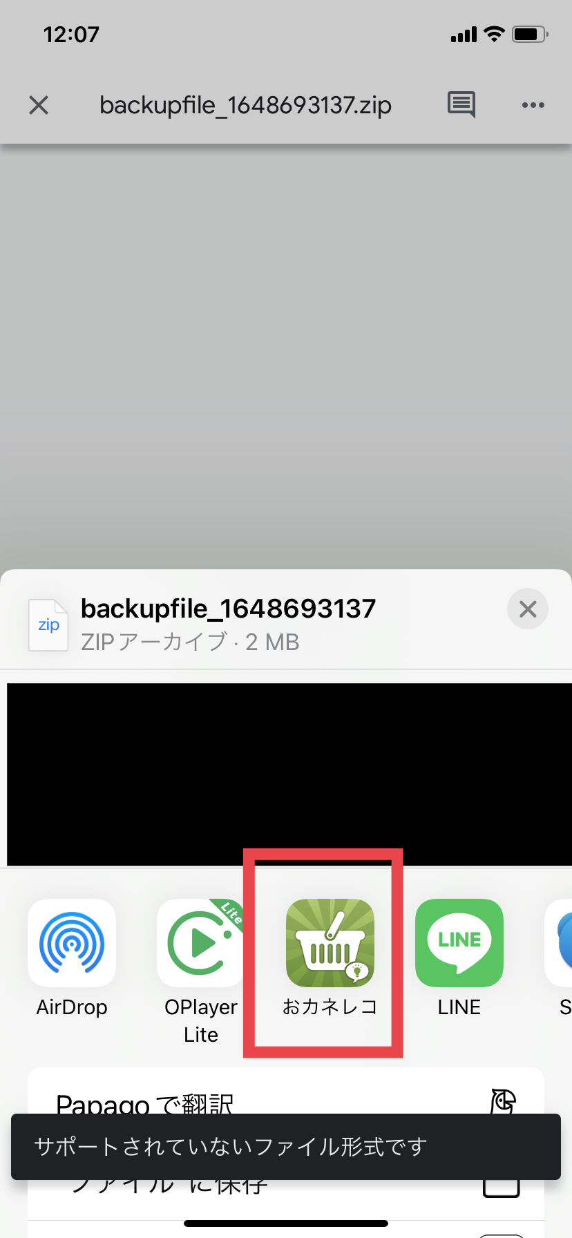 7. 共有シートで「おカネレコ」または「おカネレコ・プレミアム」を選択します。(左右にスクロールしてお探しください)