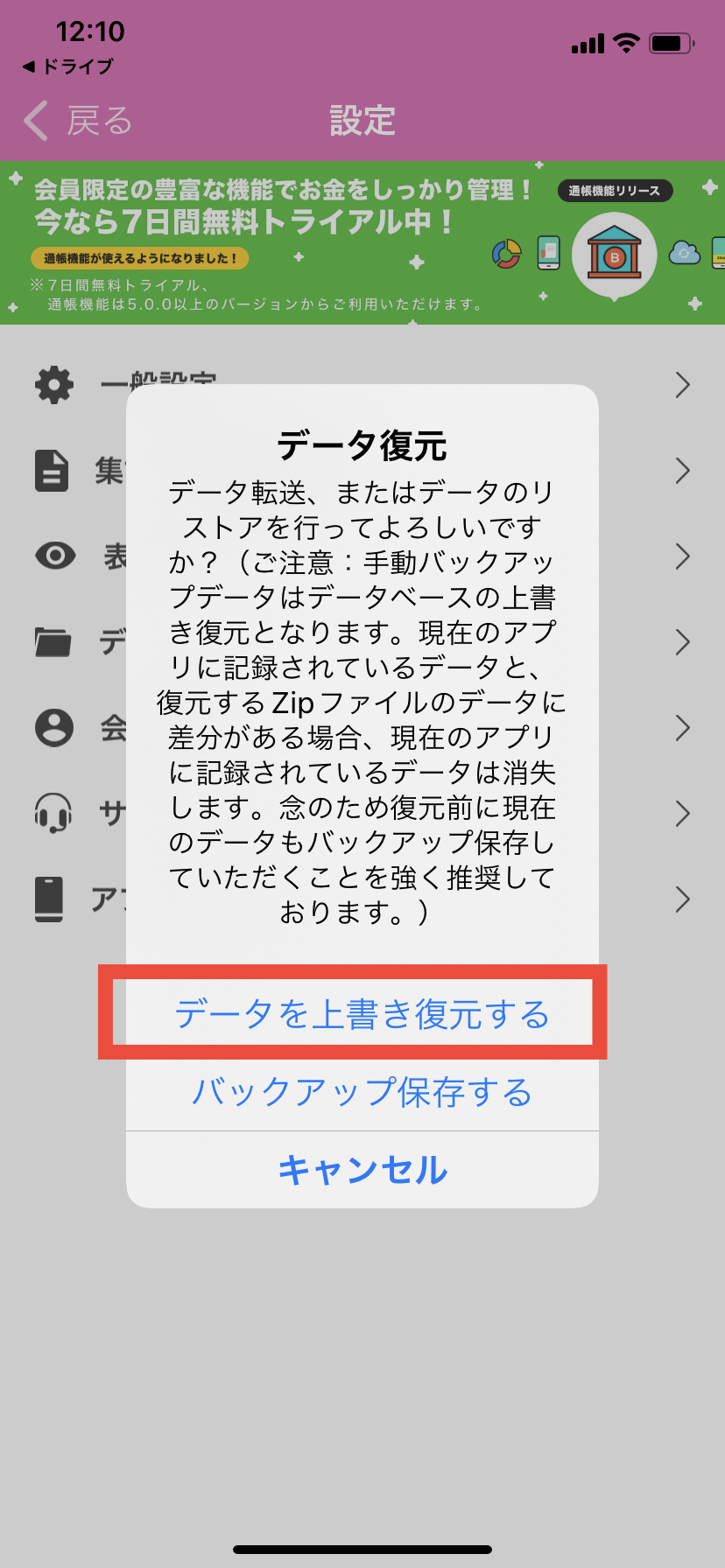 ※アプリ内にバックアップデータに含まれない新規データや編集したデータがある場合、これらは上書き時には消失してしまいますのでご注意ください。スクリーンショットやメモなどにお控えいただき、復元後に再度ご入力をお願いします。