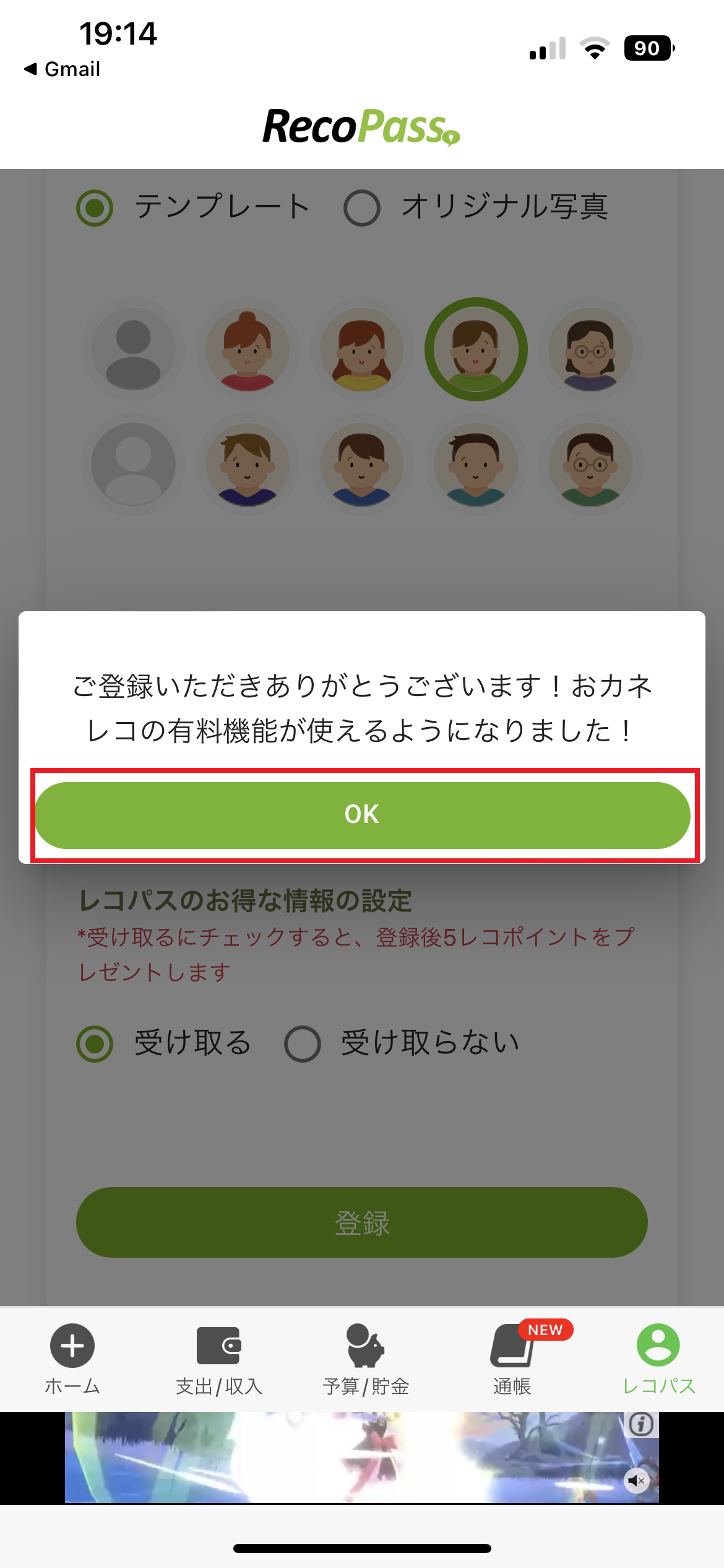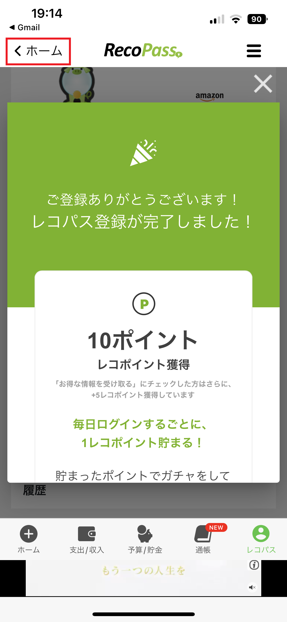 10.レコパス登録完了のメッセージが表示されましたら、画面左上の「<ホーム」を押し、おカネレコアプリ画面に戻ります。