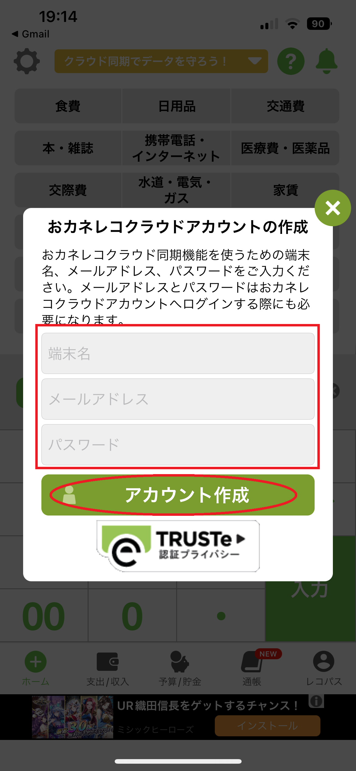13.端末名、メールアドレス、パスワードを入力します。