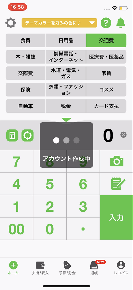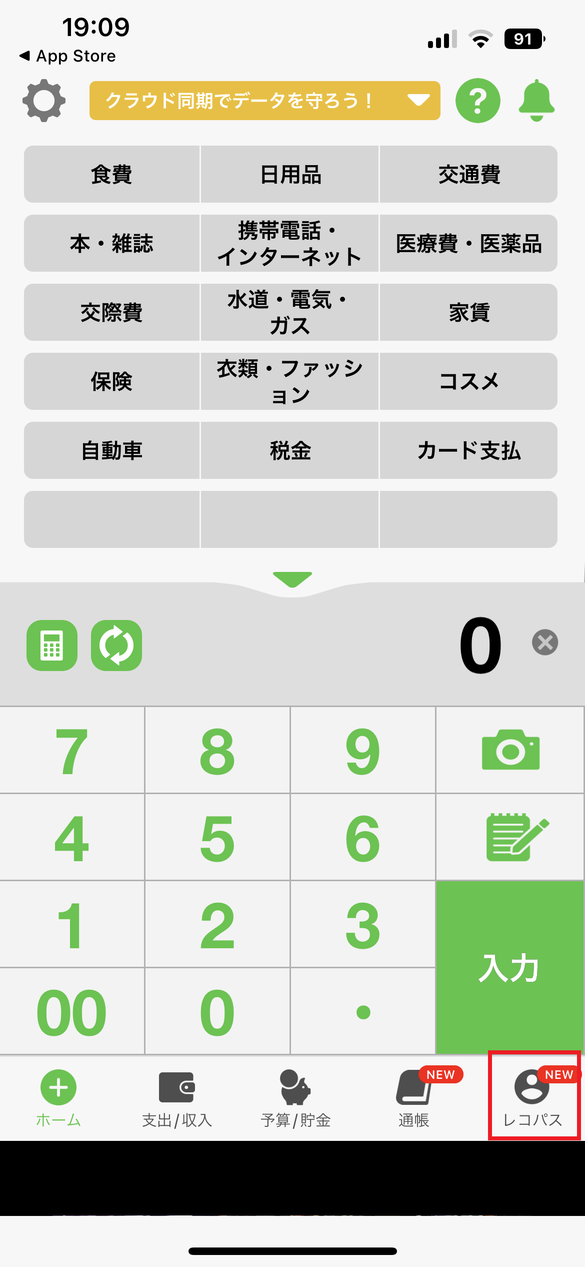 1.おカネレコのホーム画面が表示されます。画面右下の「レコパス」を押し、レコパスのご登録を行います。