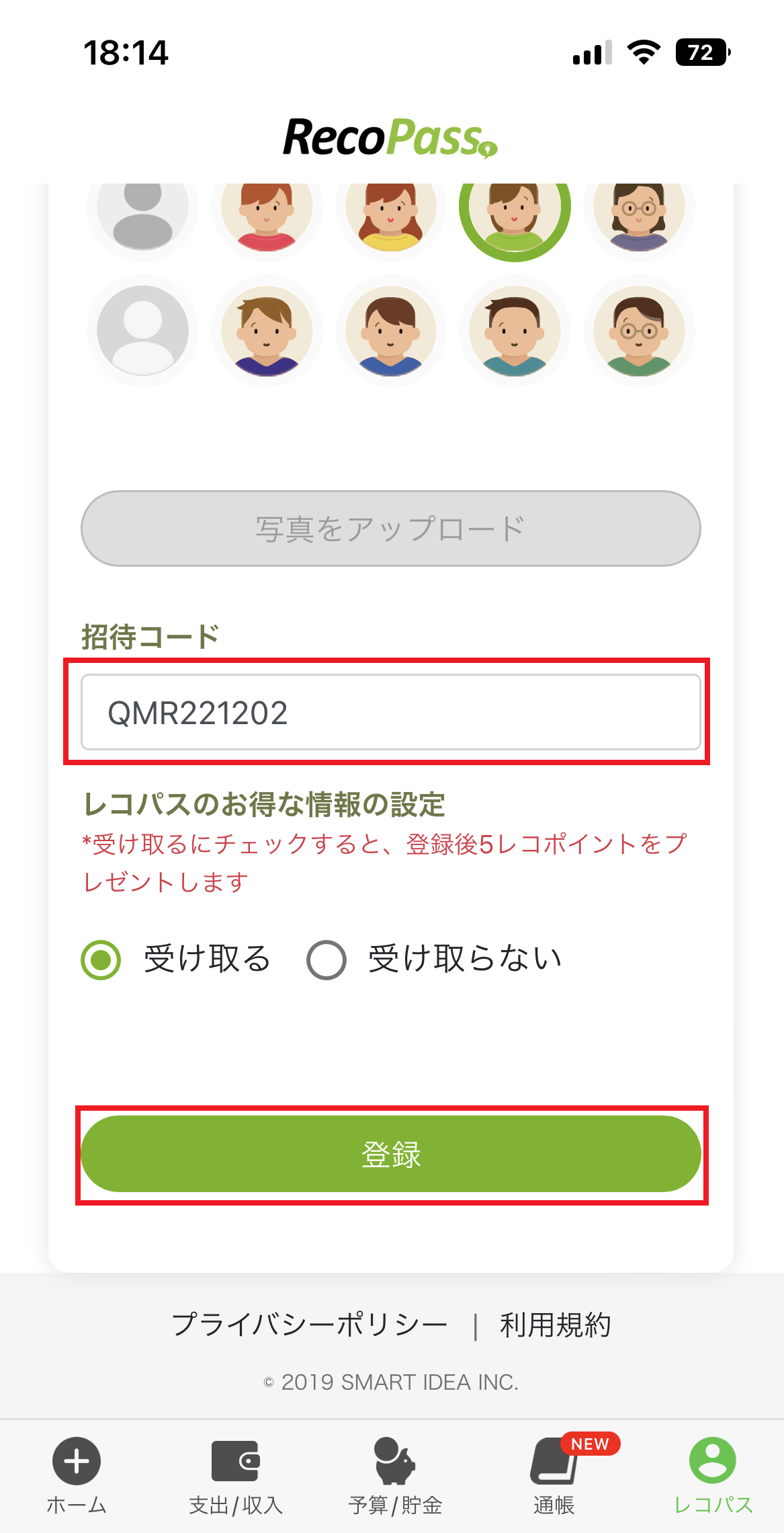 8.「招待コード」欄にクーポンコードを入力し、「登録」を押します。
