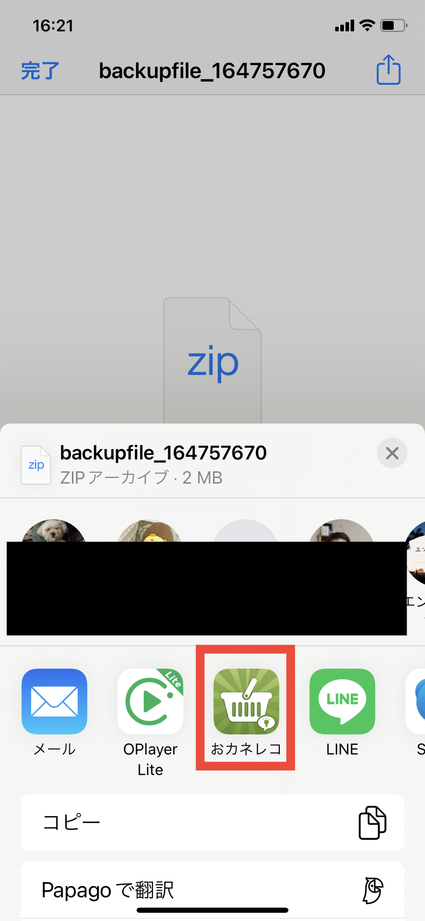 5. 共有シートで「おカネレコ」または「おカネレコ・プレミアム」を選択します。(左右にスクロールしてお探しください)
