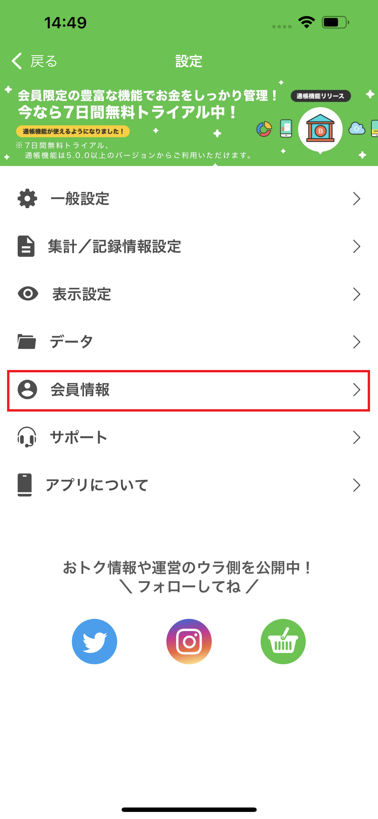 2.「会員情報」を押します。