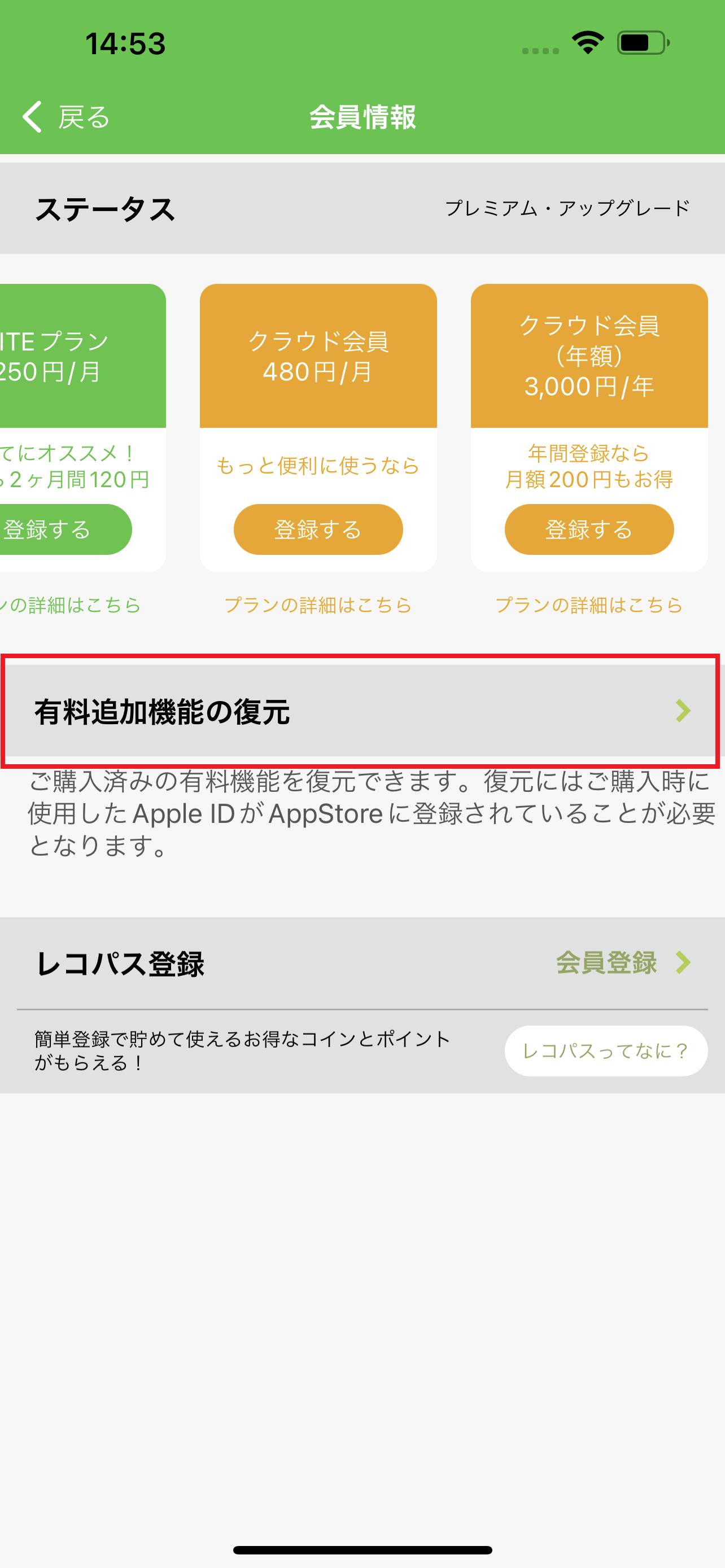 アプリの再インストールや同一OS間での機種変更後に押していただくと、過去に購入した機能を引き継ぐことができます。(※タップしていただいても新たに課金が行われるものではございません。)