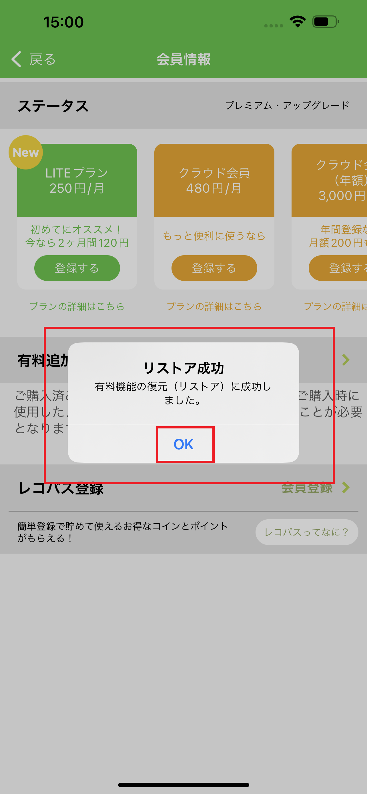 4. 「プレミアム機能リストア 過去に購入されたプレミアム機能をリストアしました」という表示がでましたら「OK」を 押します。