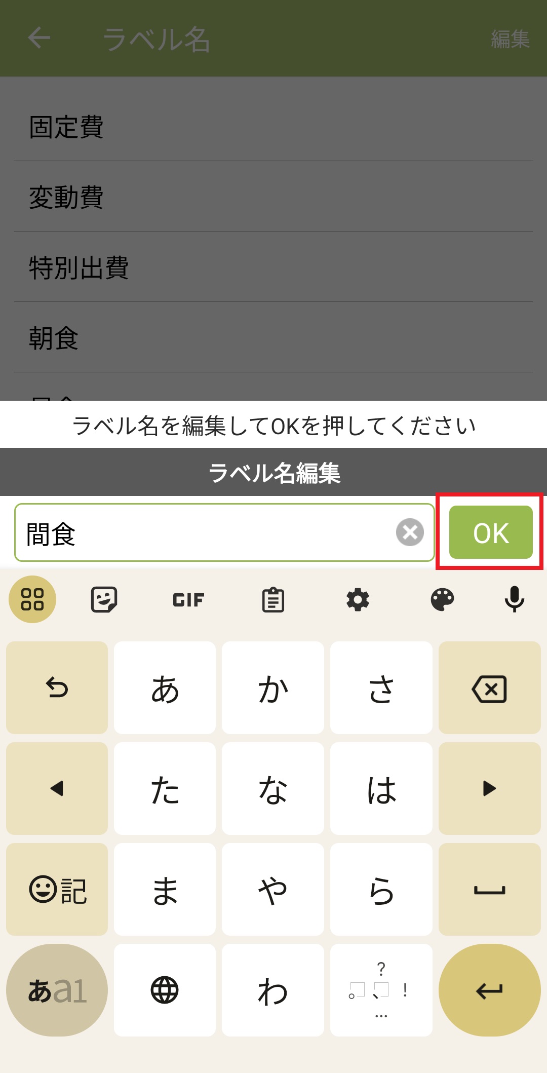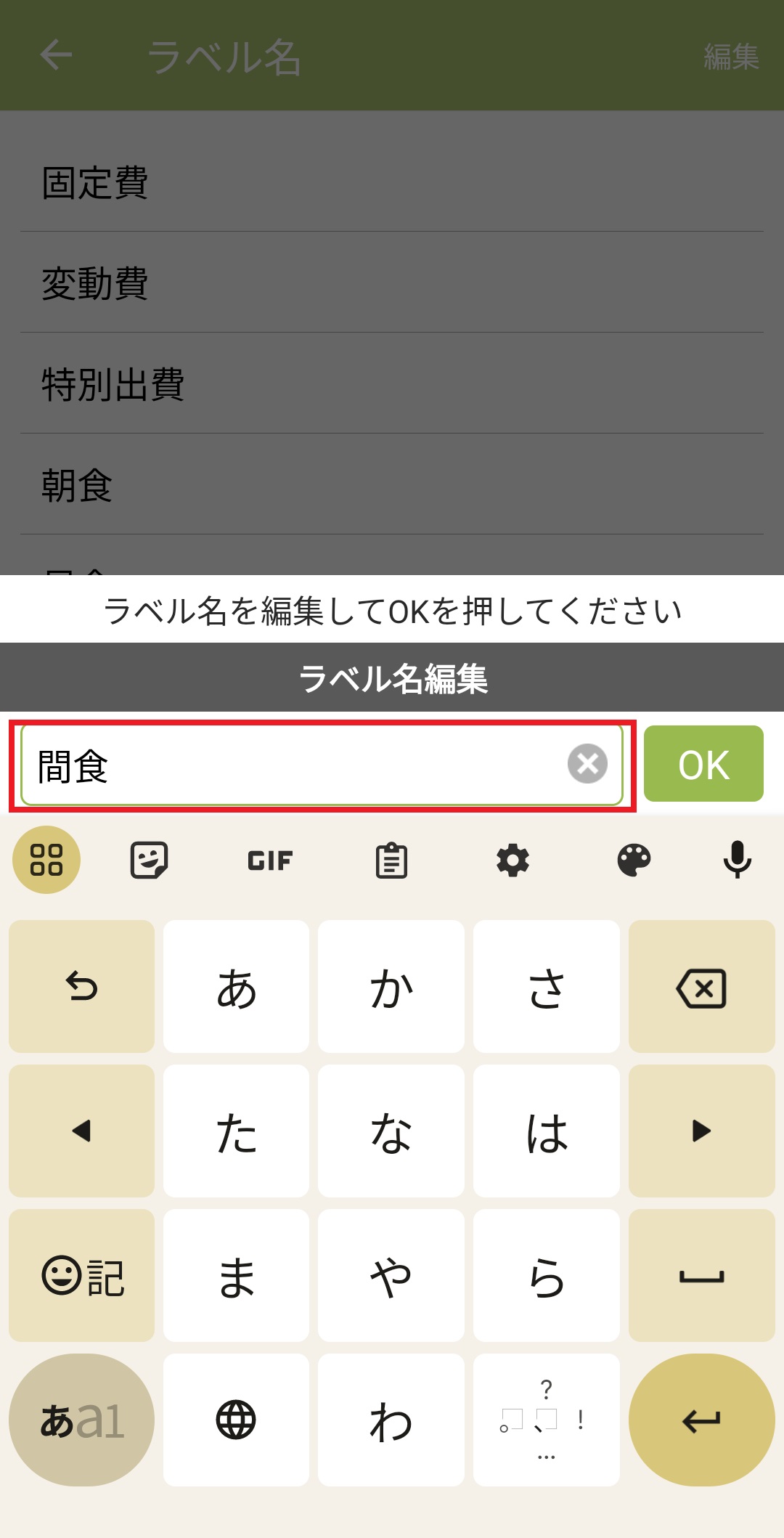 ラベル名の編集 Android版 2024/06/24 1.おカネレコのホーム画面下の「設定」ボタンを押します。 2.「集計/記録情報設定」を押します。 3.「ラベル設定」を押します。 4.「ラベルリスト」を押します。 5.名称を変更したいラベルを選択します。 6.ラベル名を入力します。 7.ラベル名の変更が完了したら「OK」を押します。 8.ラベル名が変更されます。 ※名称を変更すると過去に該当のラベルを使用していた「出費/収入」のラベルも自動で変更されます。