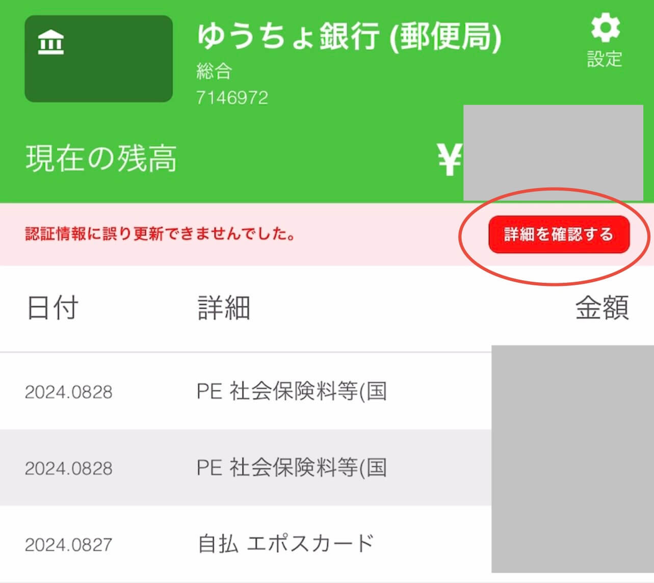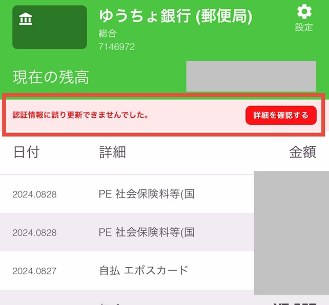 通帳の詳細画面で”認証情報に誤り更新できませんでした。”と表示される場合は下記をお試し下さい。