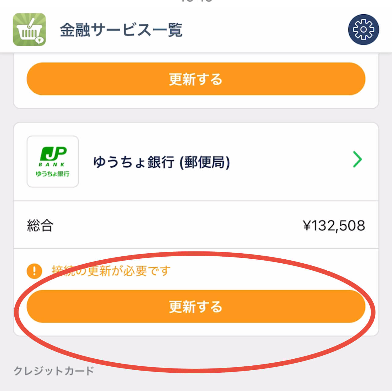 9.「金融サービスを選択」で 「銀行」右端の「>」を押します。残高を更新したい銀行名下の「更新する」を押します。