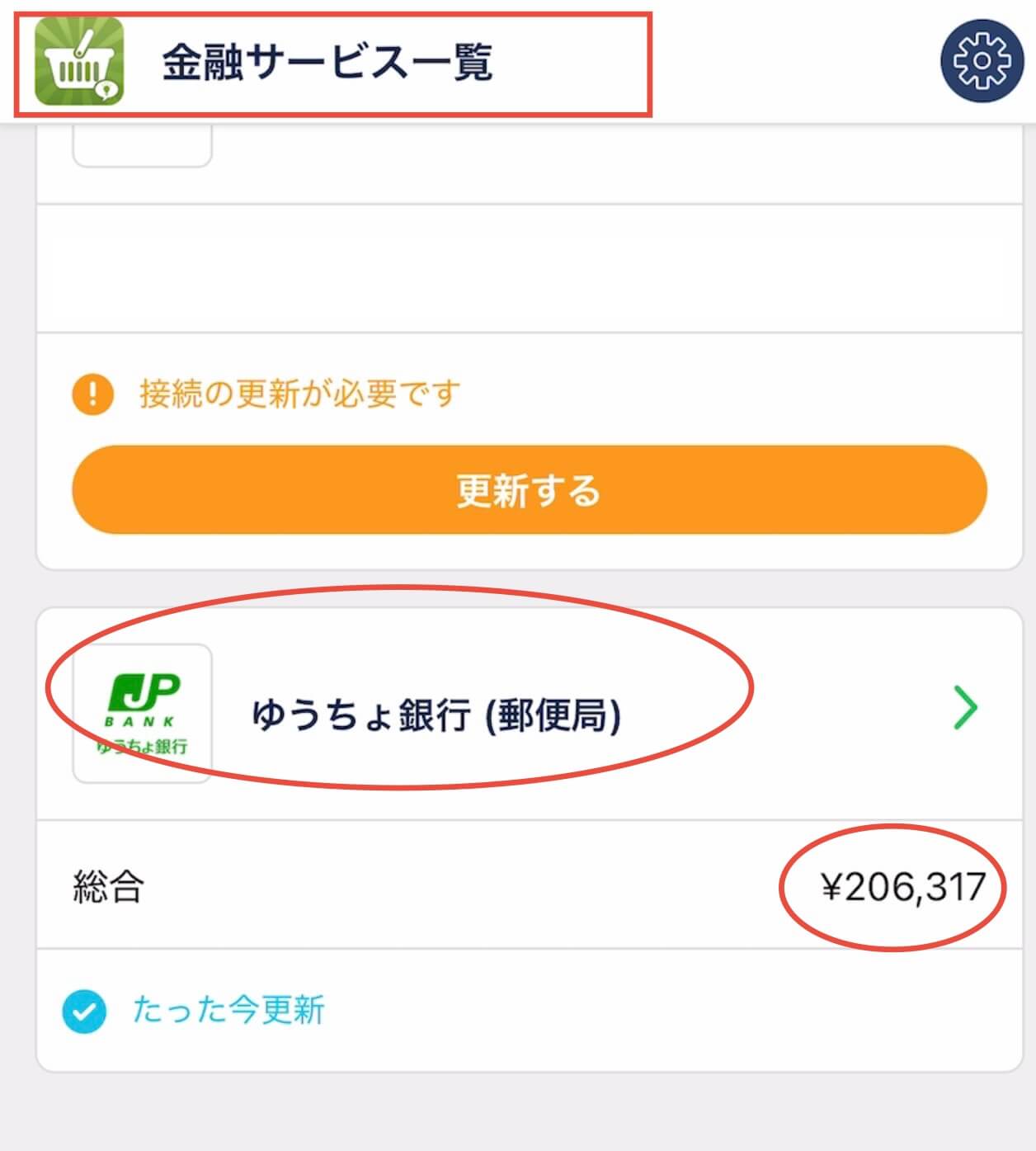 13.金融サービス一覧 接続済みのサービスとして、先ほど連携した銀行が表示されますので(スクロールで表示)正しい残高になっていることを確認する。