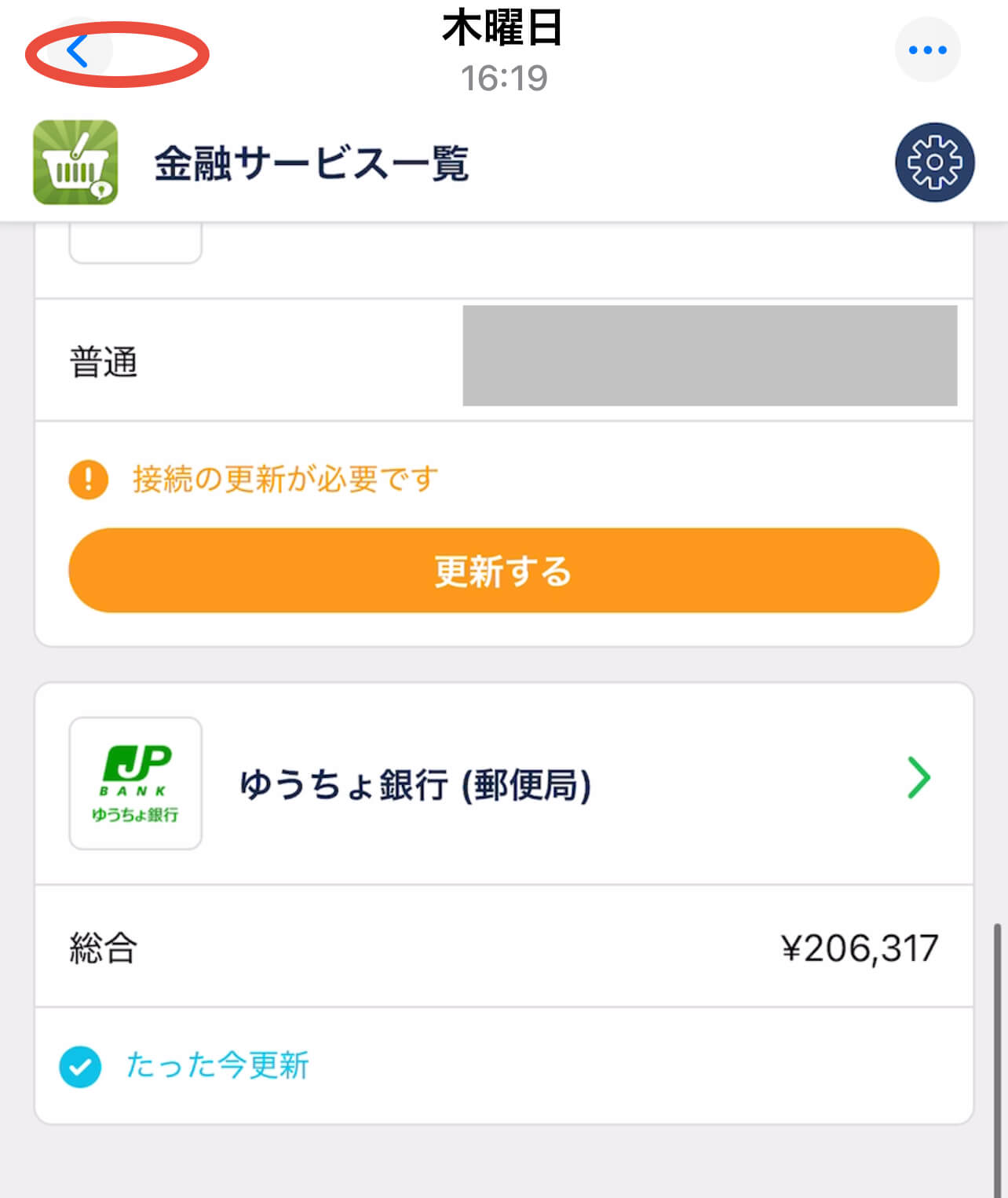 14.左上の「<」を押し「おカネレコ」通帳・銀行画面に戻り数秒たつと正しい残高が反映される。
