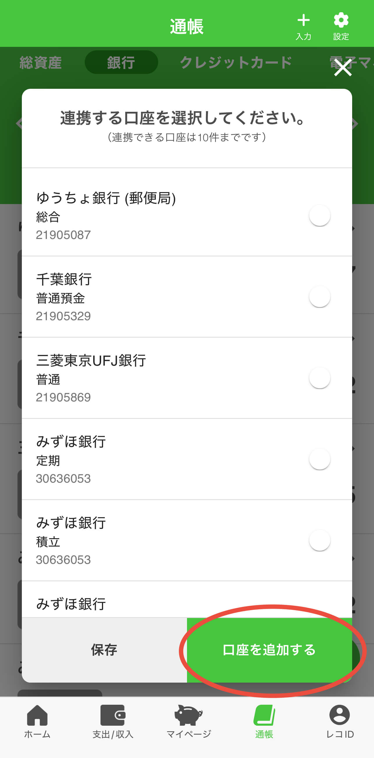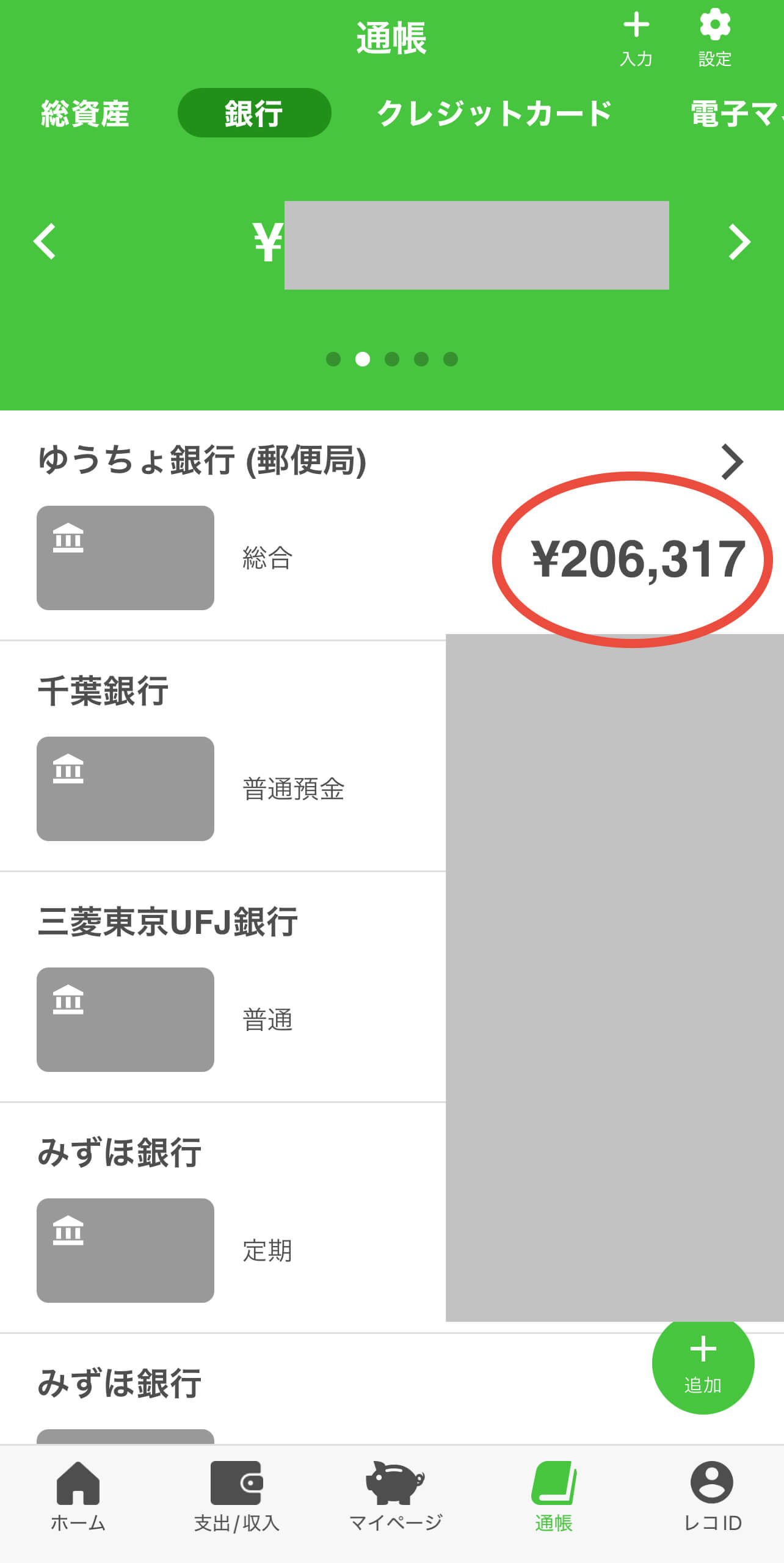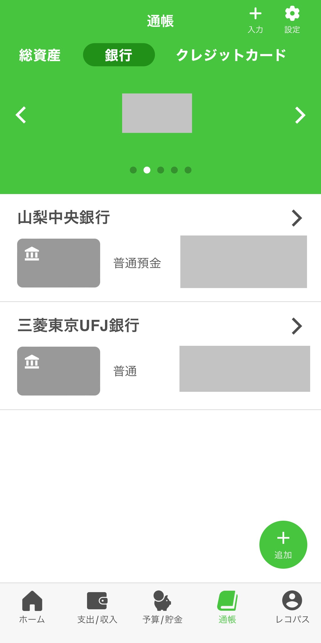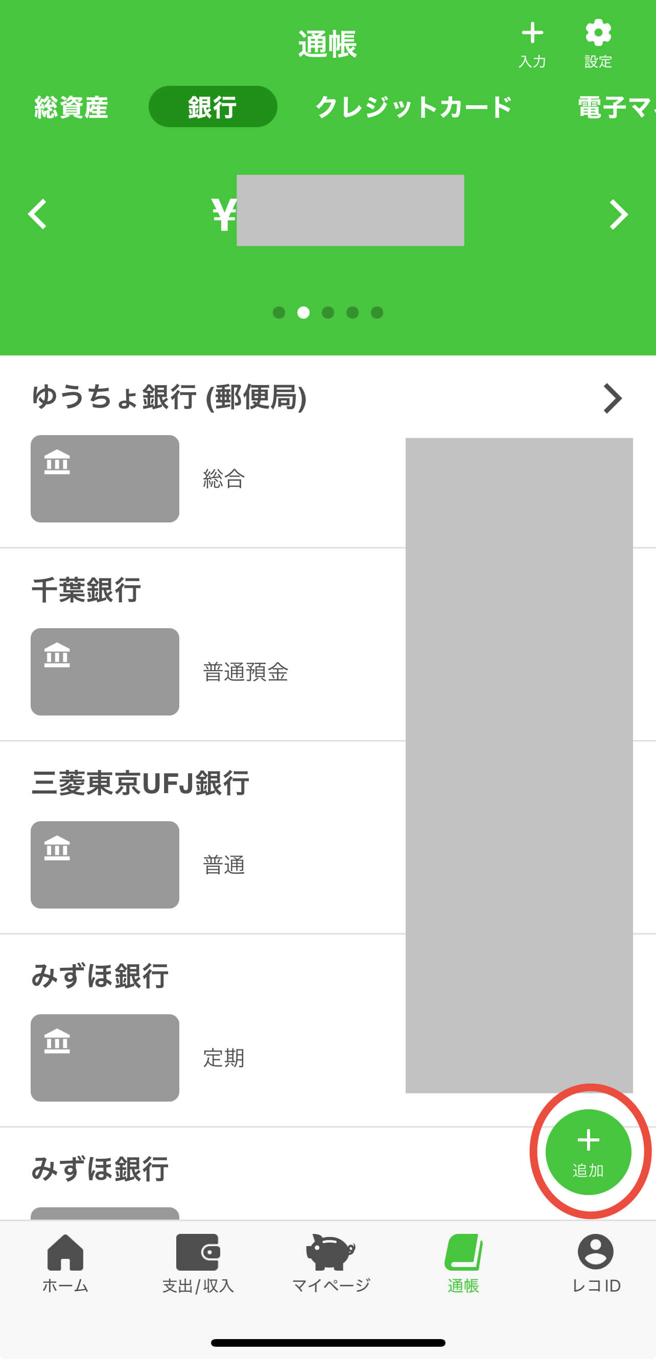 6.「おカネレコ」通帳 銀行画面に戻ったら、右下の「追加」を押します。