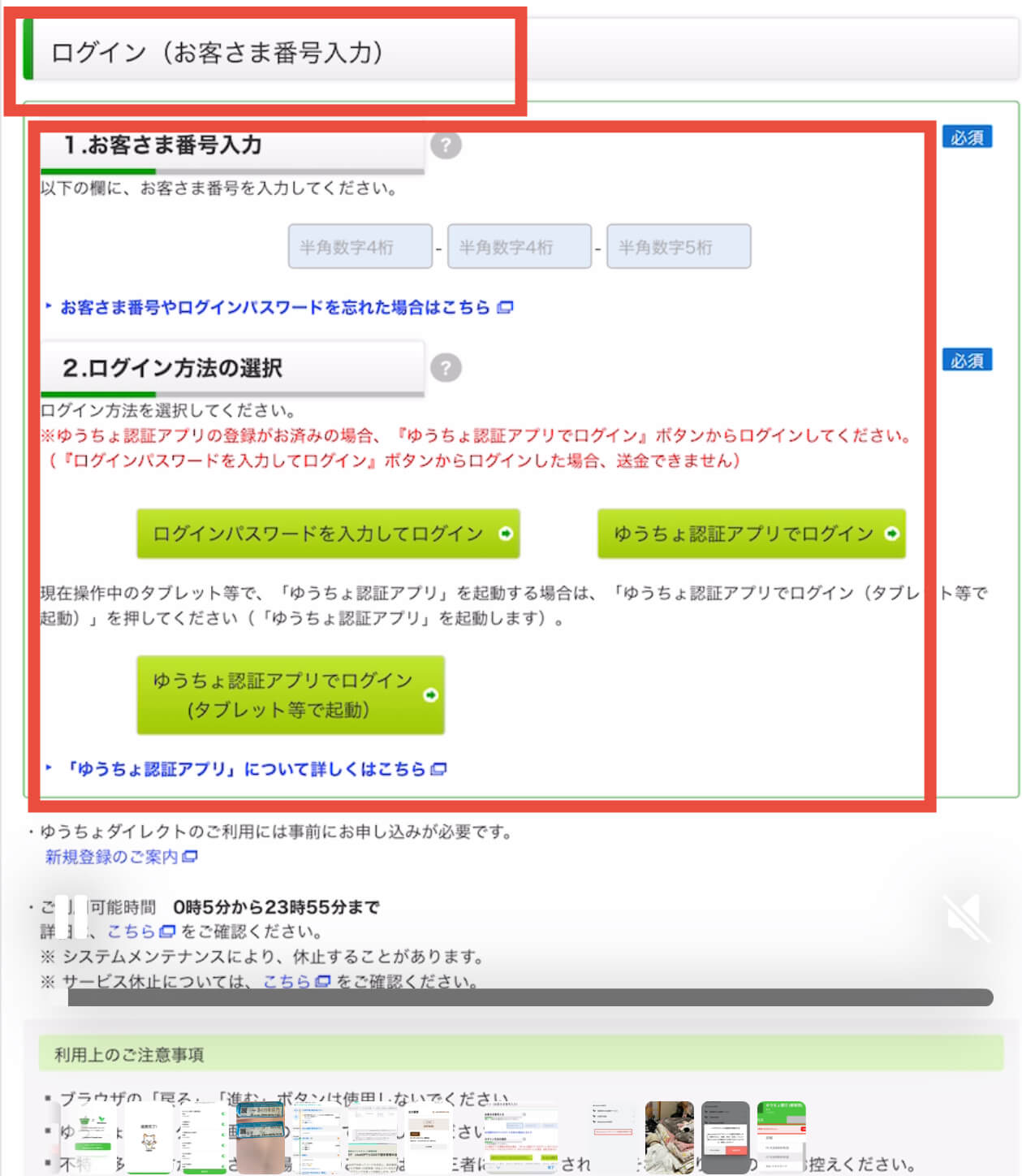 3.残高の合わない銀行のネットパンキングのページが表示される。(例:ゆうちょ銀行)