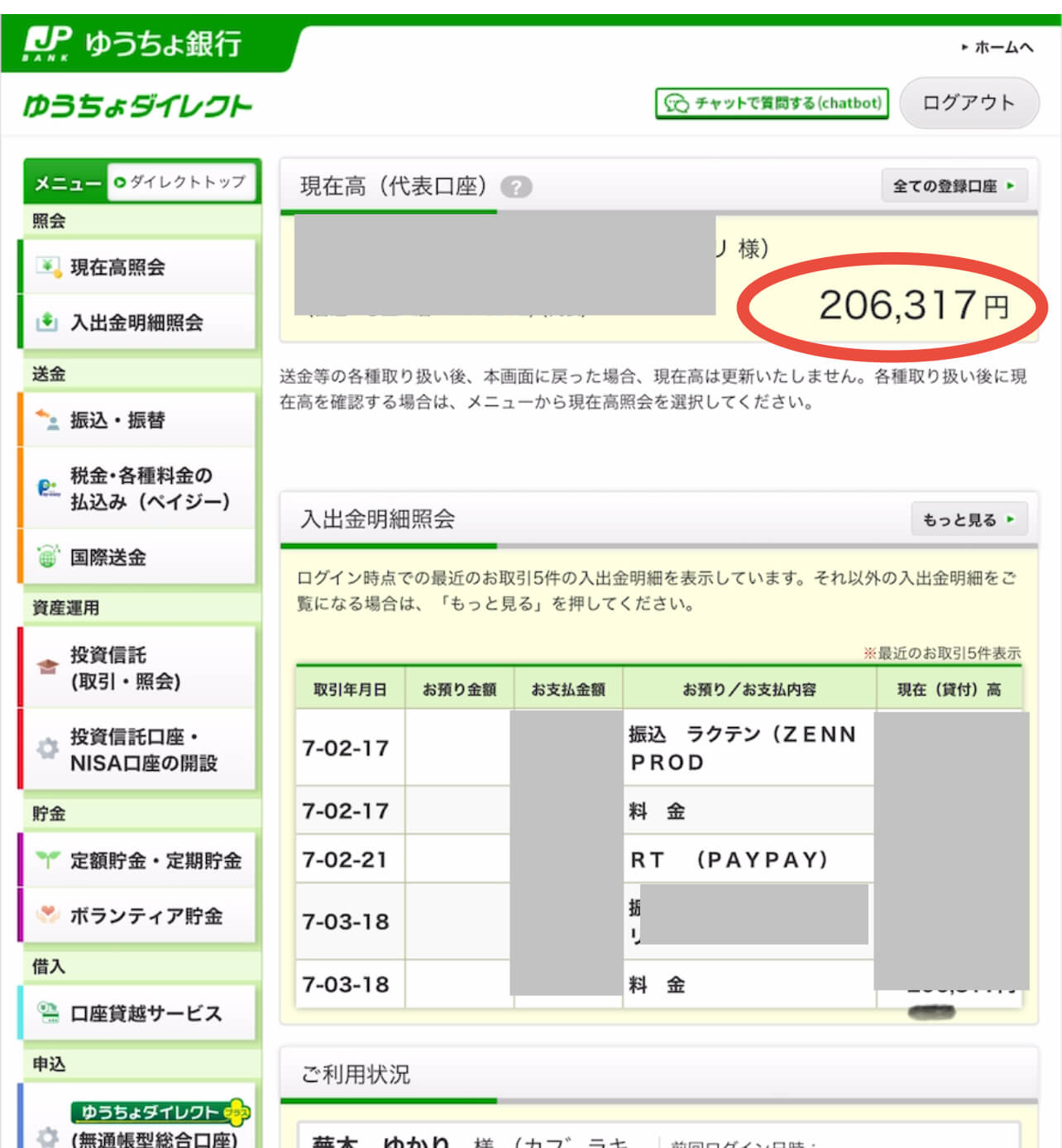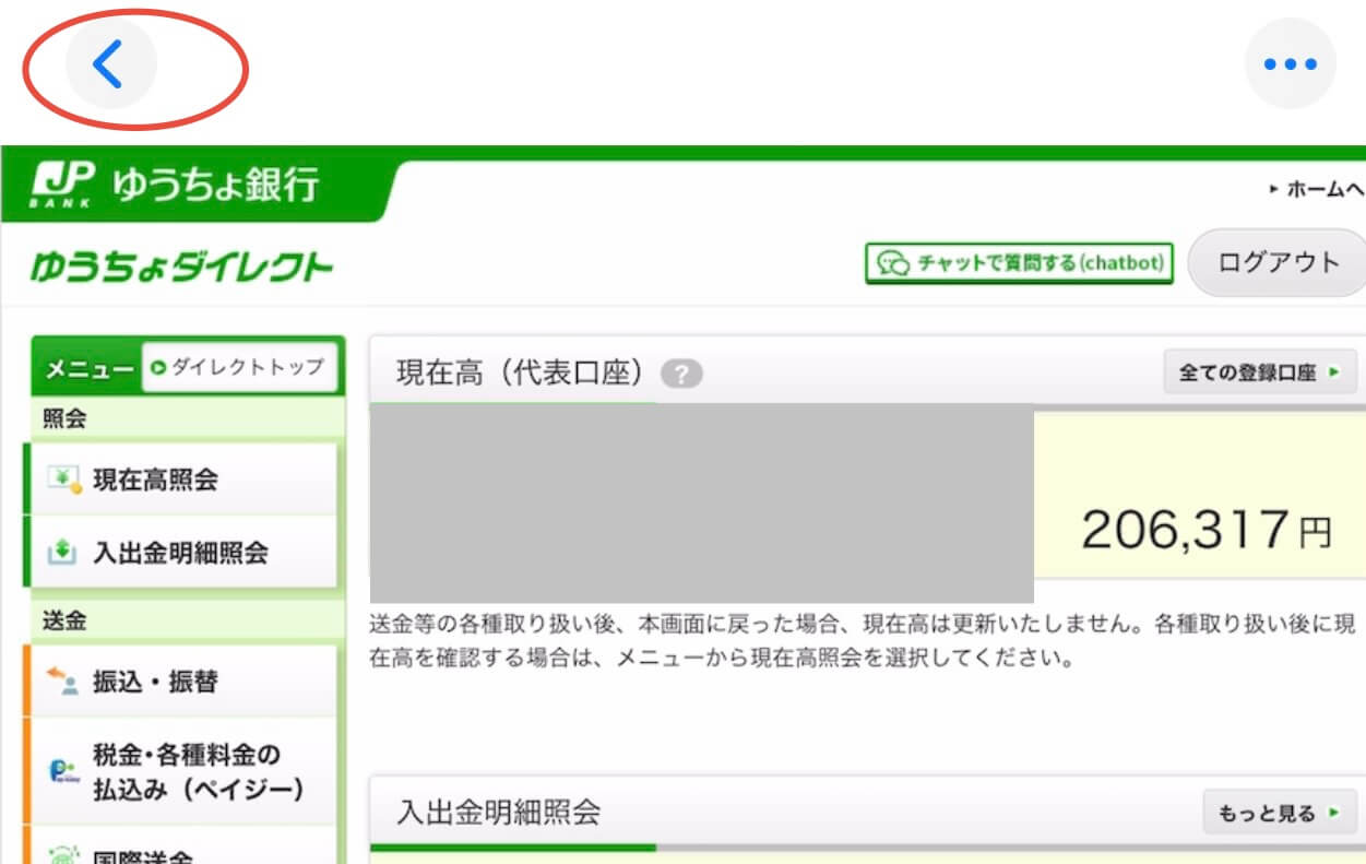 4.ログイン後、ネットバンキング上で正しい残高が表示され確認します。(例:ゆうちょ銀行)