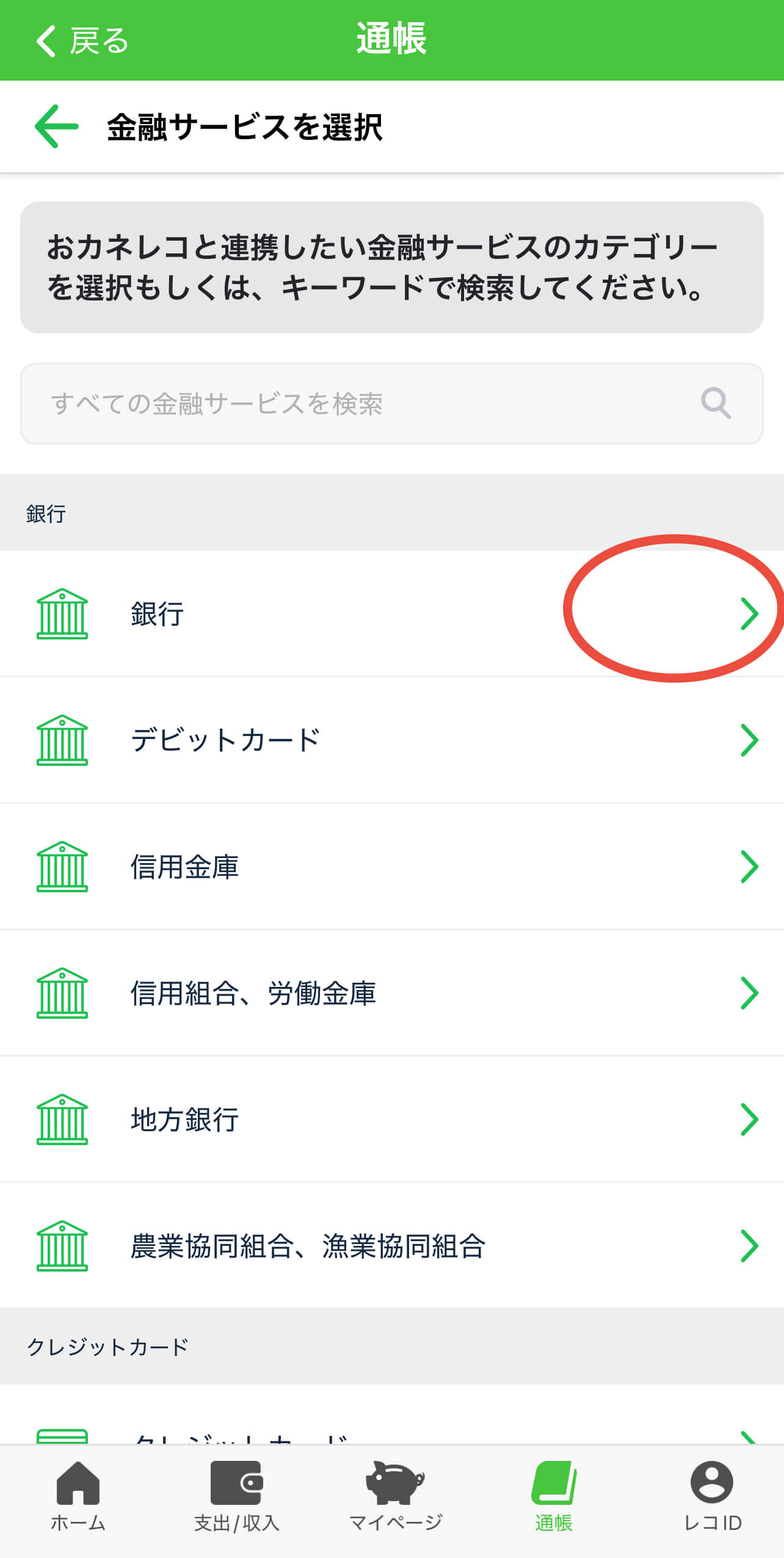 1.おカネレコを起動し、入力画面下部の「通帳」ボタンを押し「銀行」を押す。残高の合わない銀行の「>」を押すと下記が表示される。