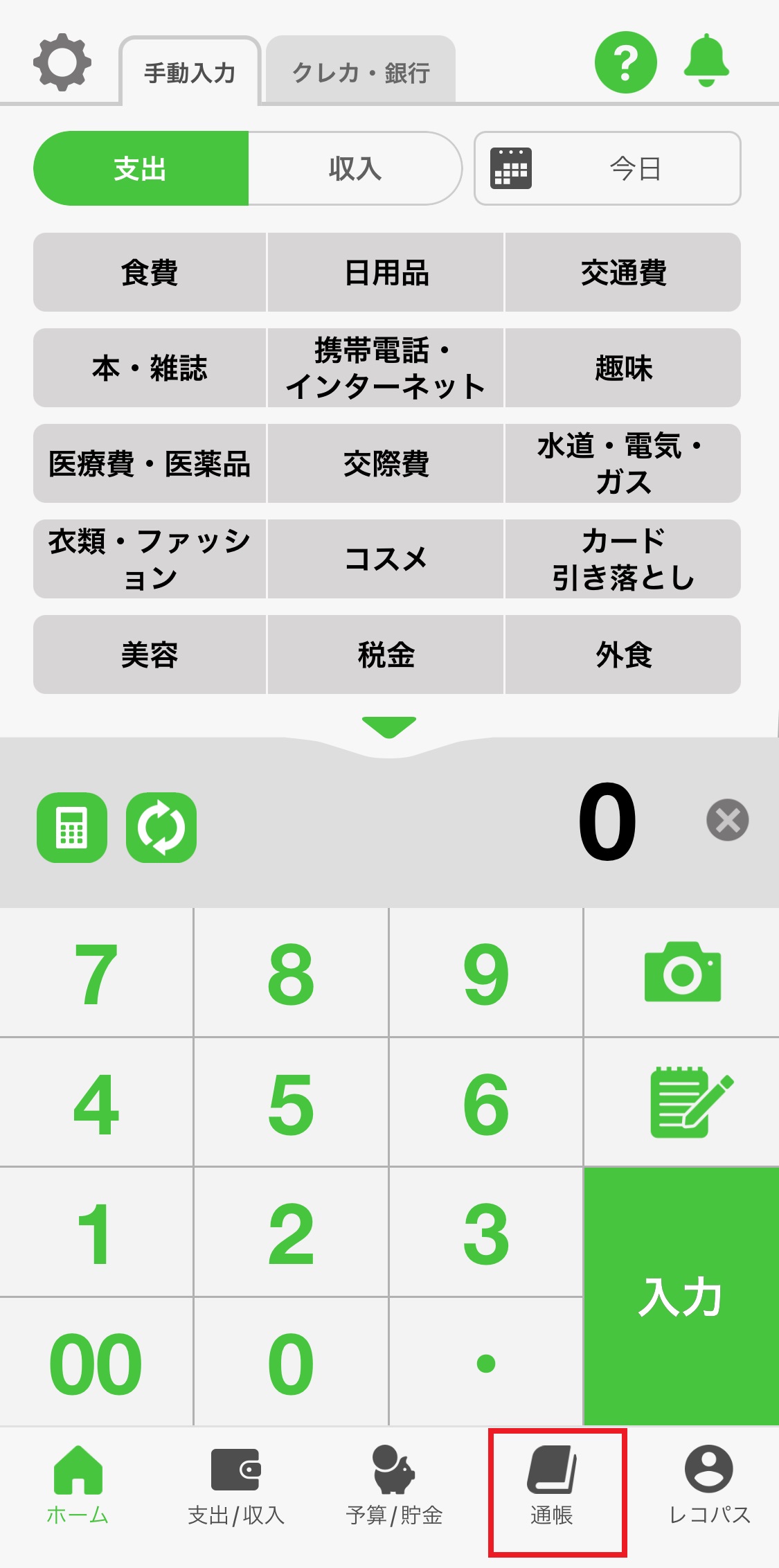 1.おカネレコを起動し、入力画面下部の「通帳」ボタンを押します。
