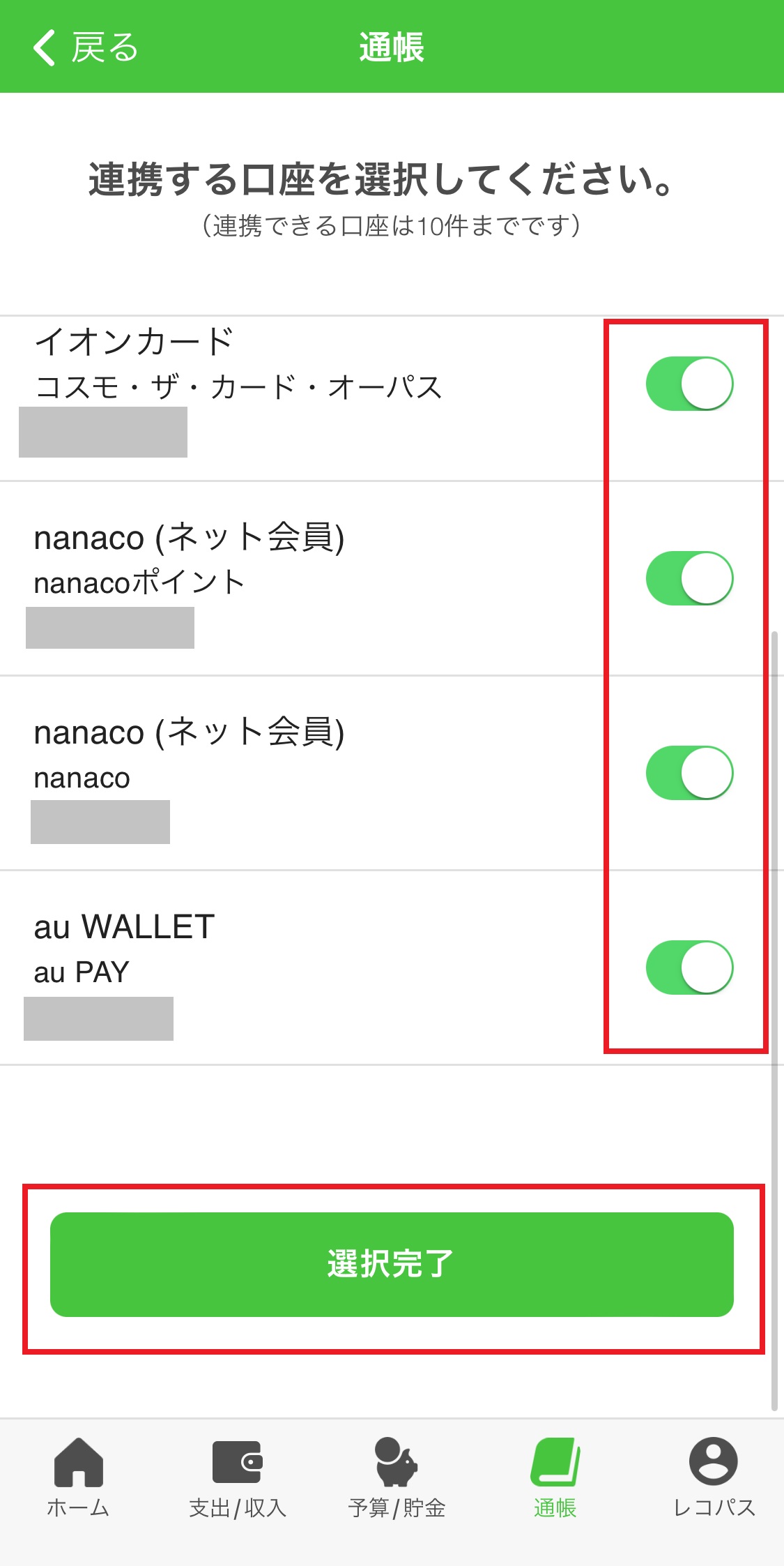 7.連携する口座・カード名を選択し、「選択完了」を押します。