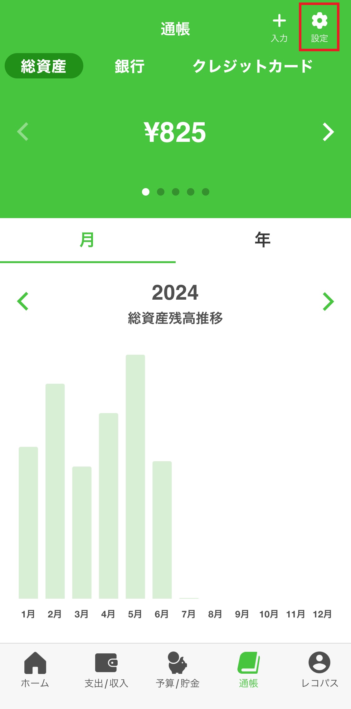 2.総資産画面が表示されます。画面右上の「設定」を押します。
