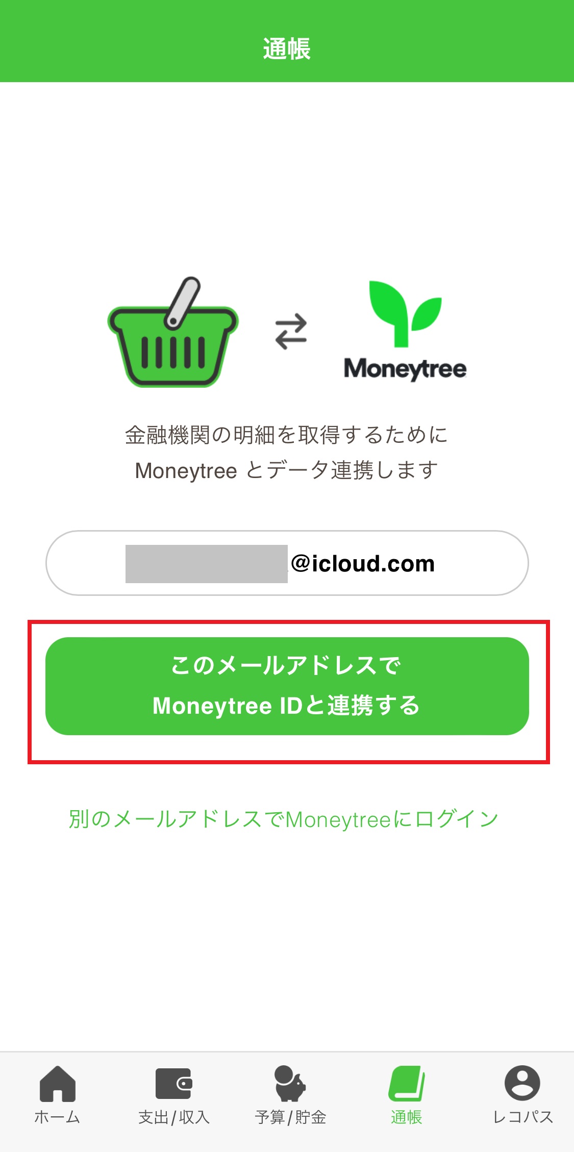 5.通帳機能トップ画面が表示されます。画面上の「このメールアドレスでMoneytree IDと連携する」ボタンを押します。