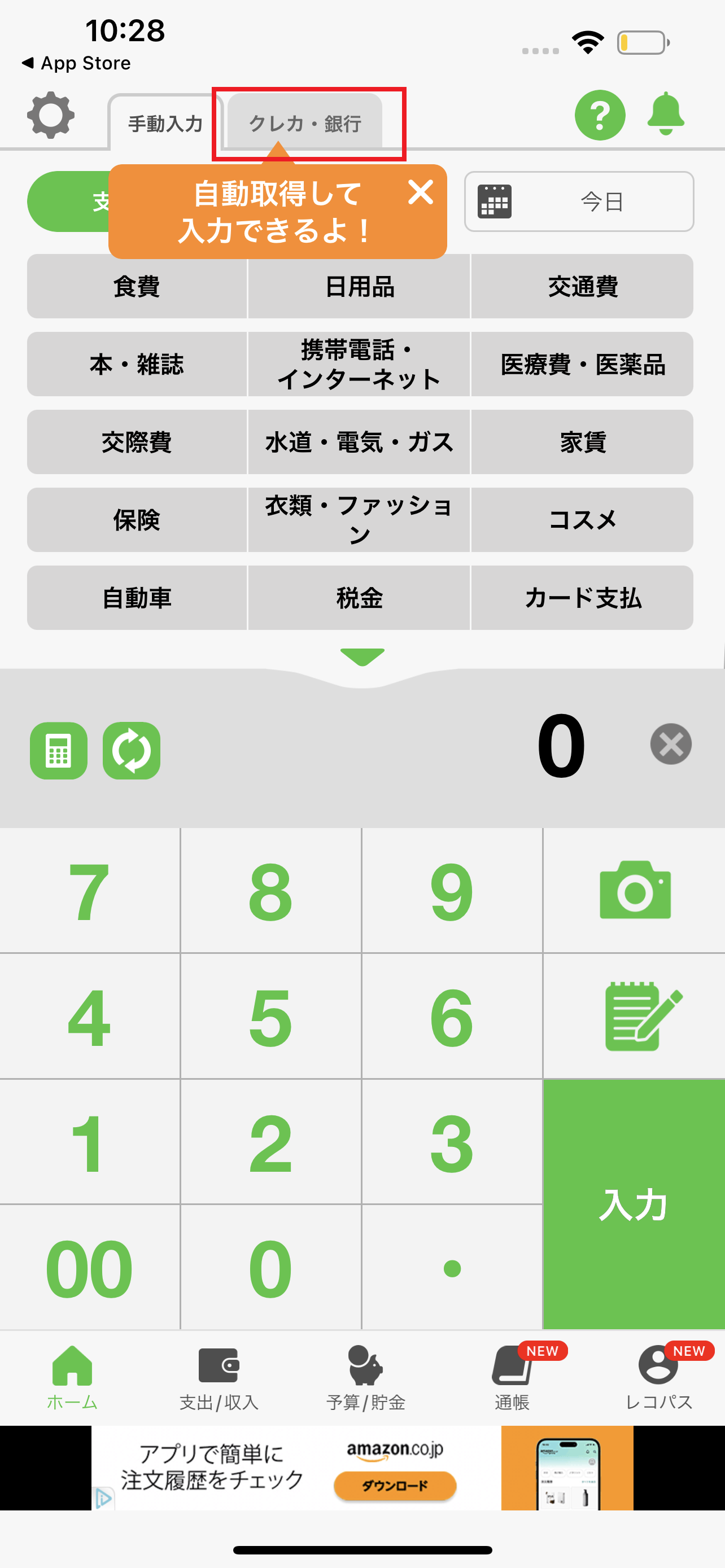 1.おカネレコを起動後、入力画面上部の「クレカ・銀行」タブを押します。