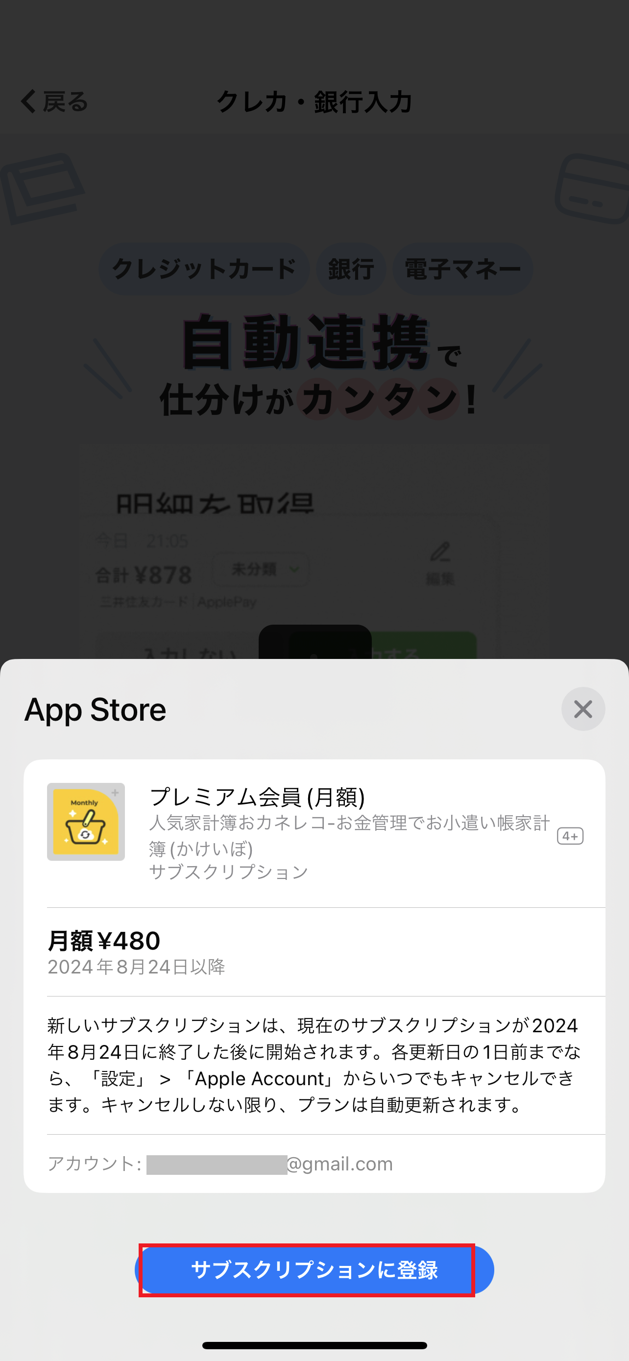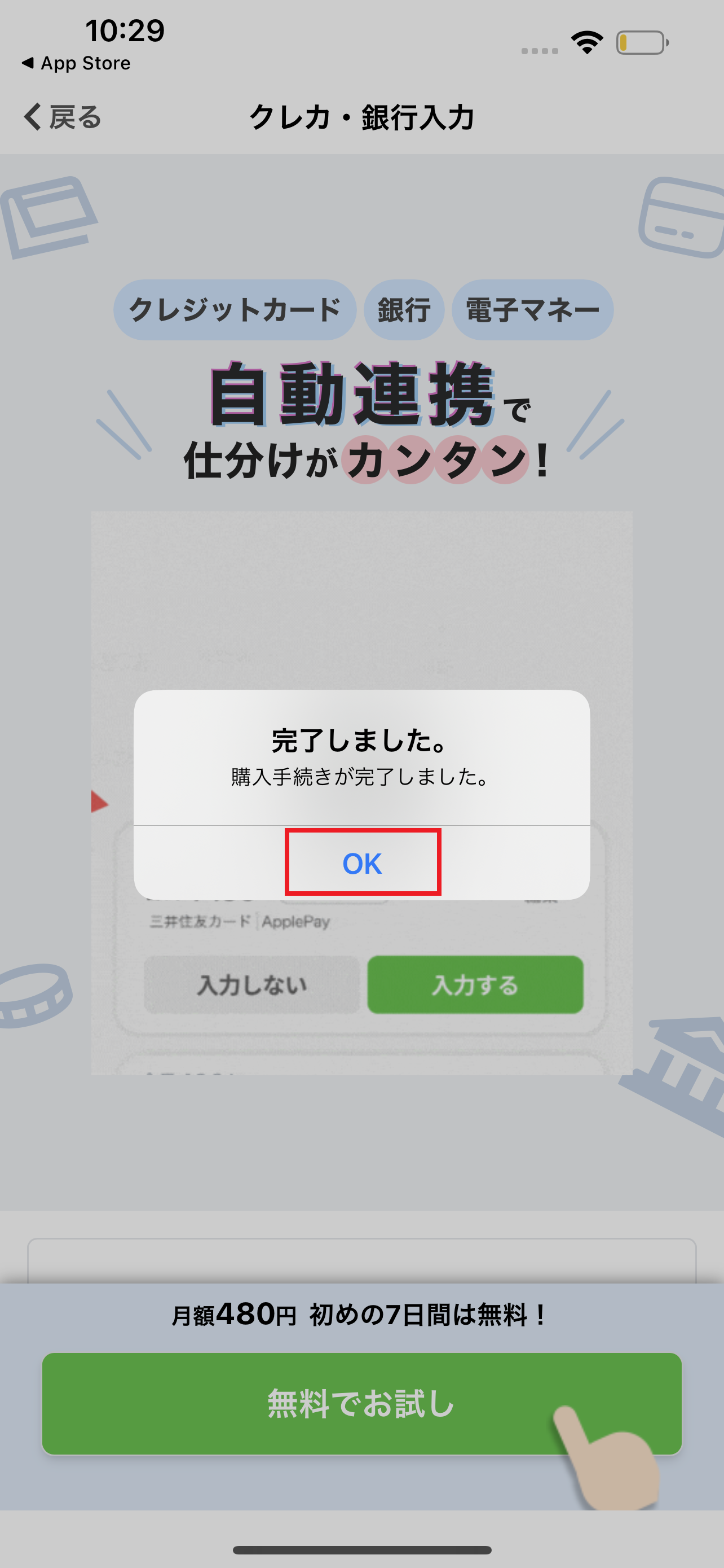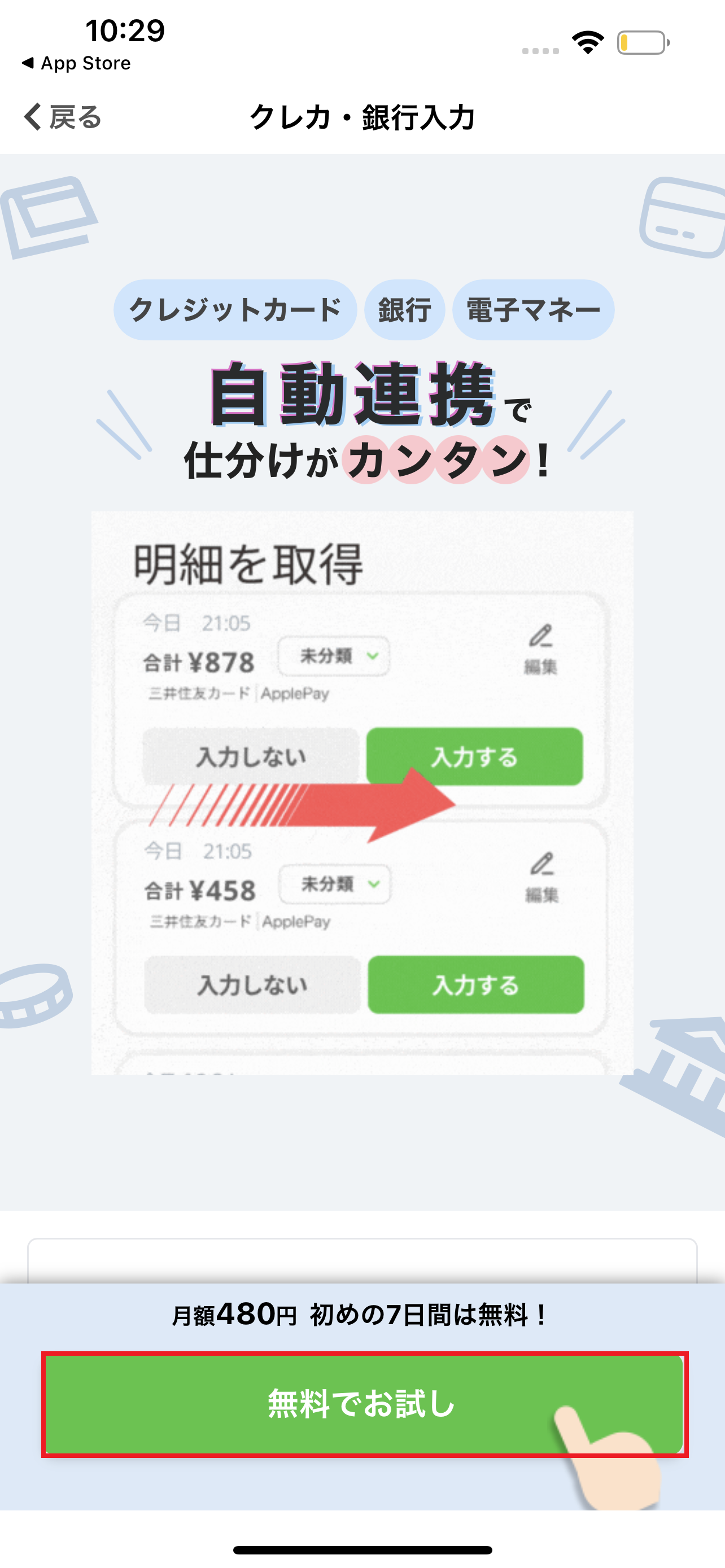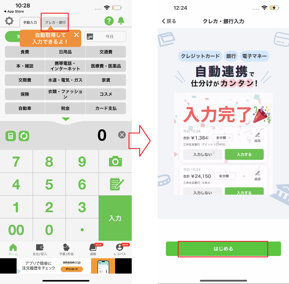 1.入力画面上部の「クレカ・銀行」タブを押し、「はじめる」ボタンを押します。
