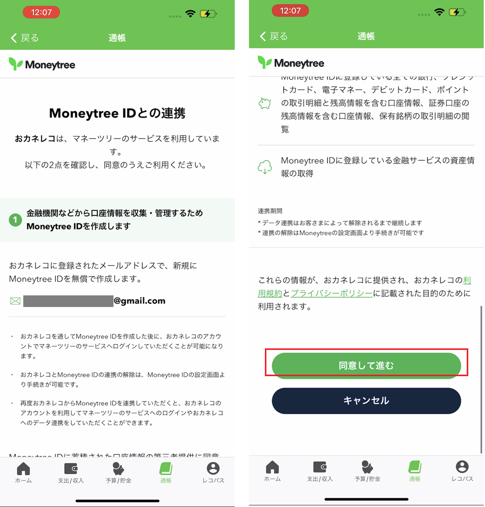 4.レコパスのご登録が終わりましたら、続いてMoneyTreeとの連携に移ります。説明文をご確認のうえ、「同意して進む」を押します。