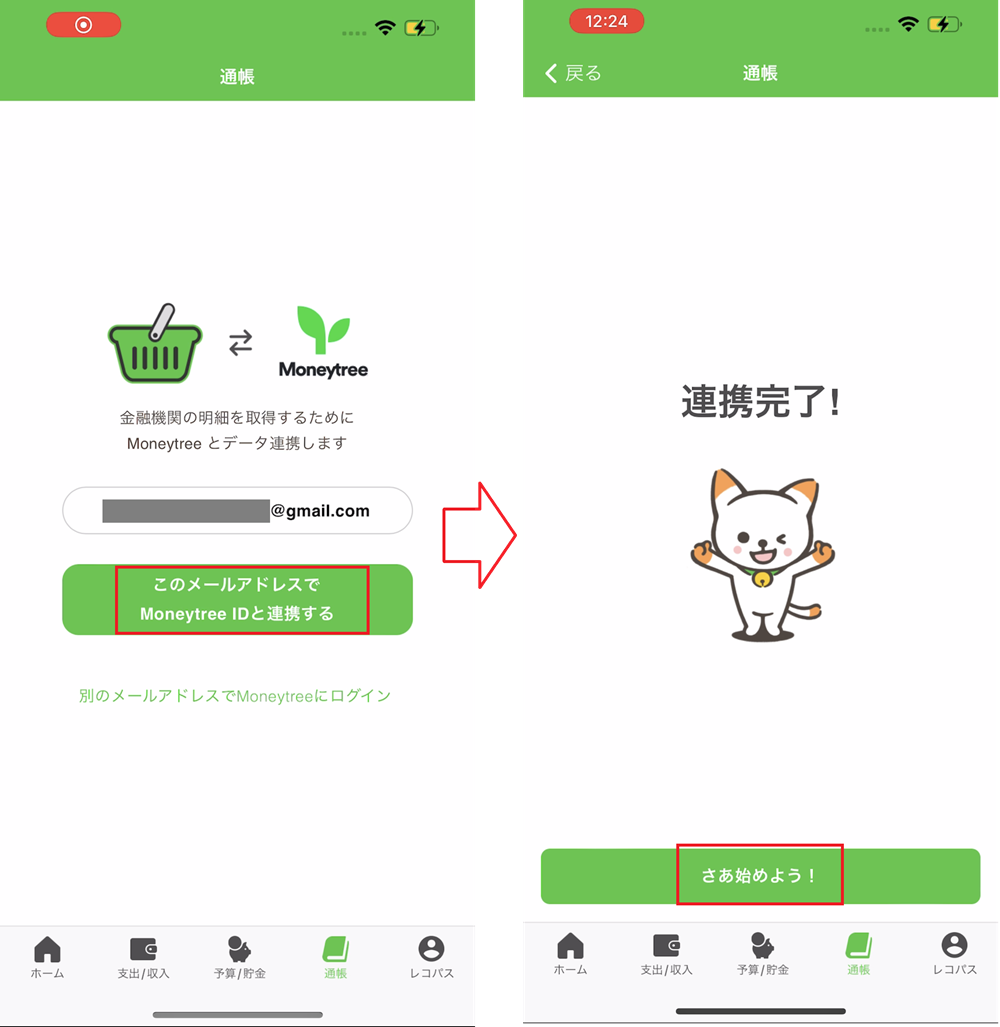 2.「このメールアドレスでMoneytreeIDと連携する」を押します。連携完了画面が表示されましたら、「さあ始めよう!」を押して金融機関の連携にお進みください。連携方法については、【金融機関の登録方法】以降の手順をご確認ください。