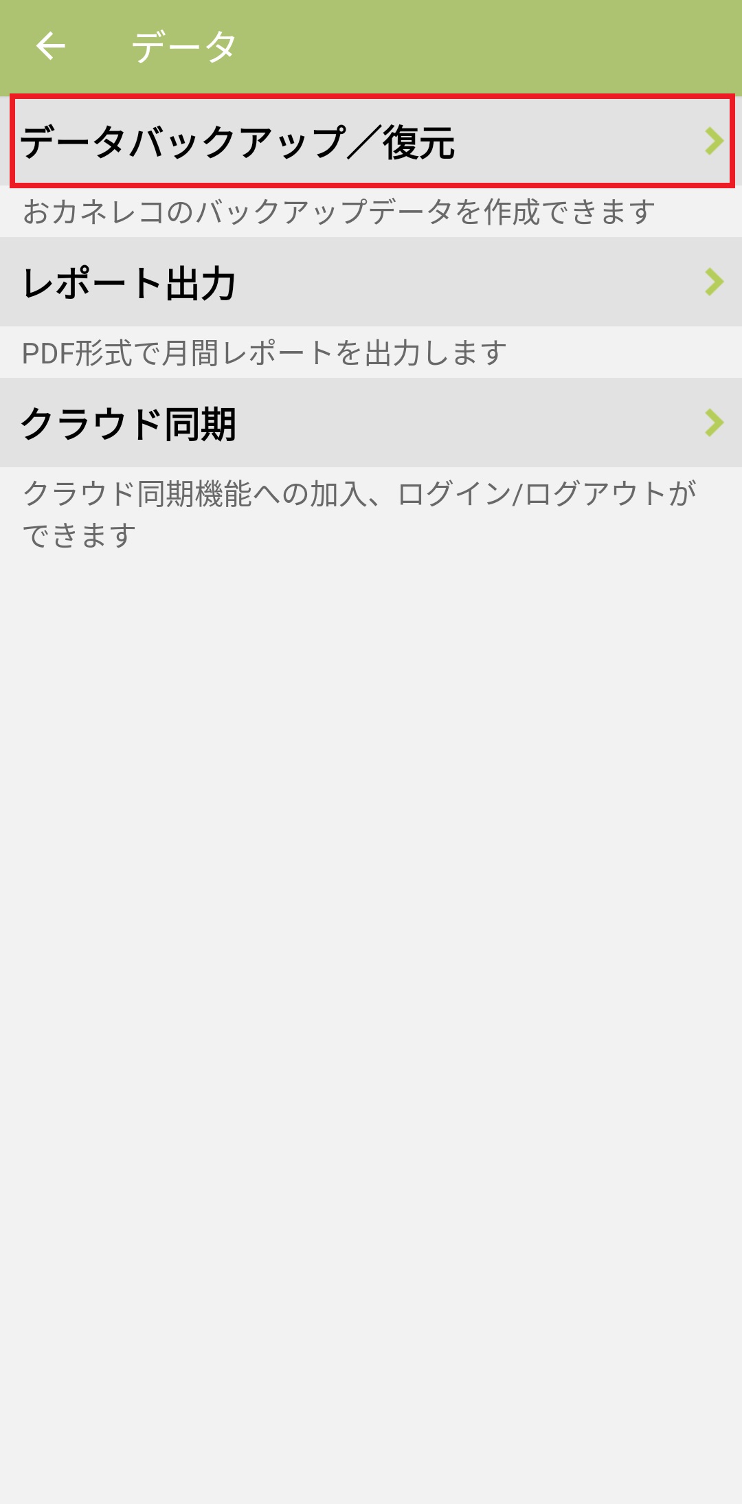 「データバックアップ/復元」ボタンが反応しないという場合は、おカネレコアプリの権限の確認の為、