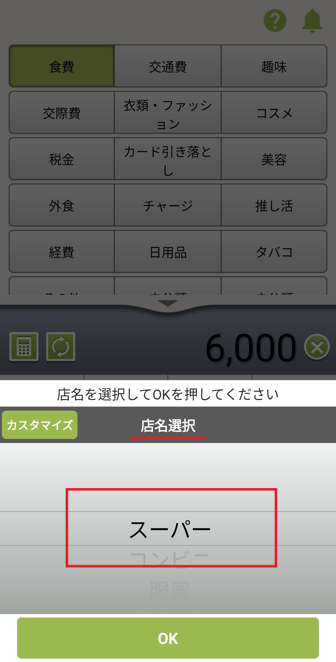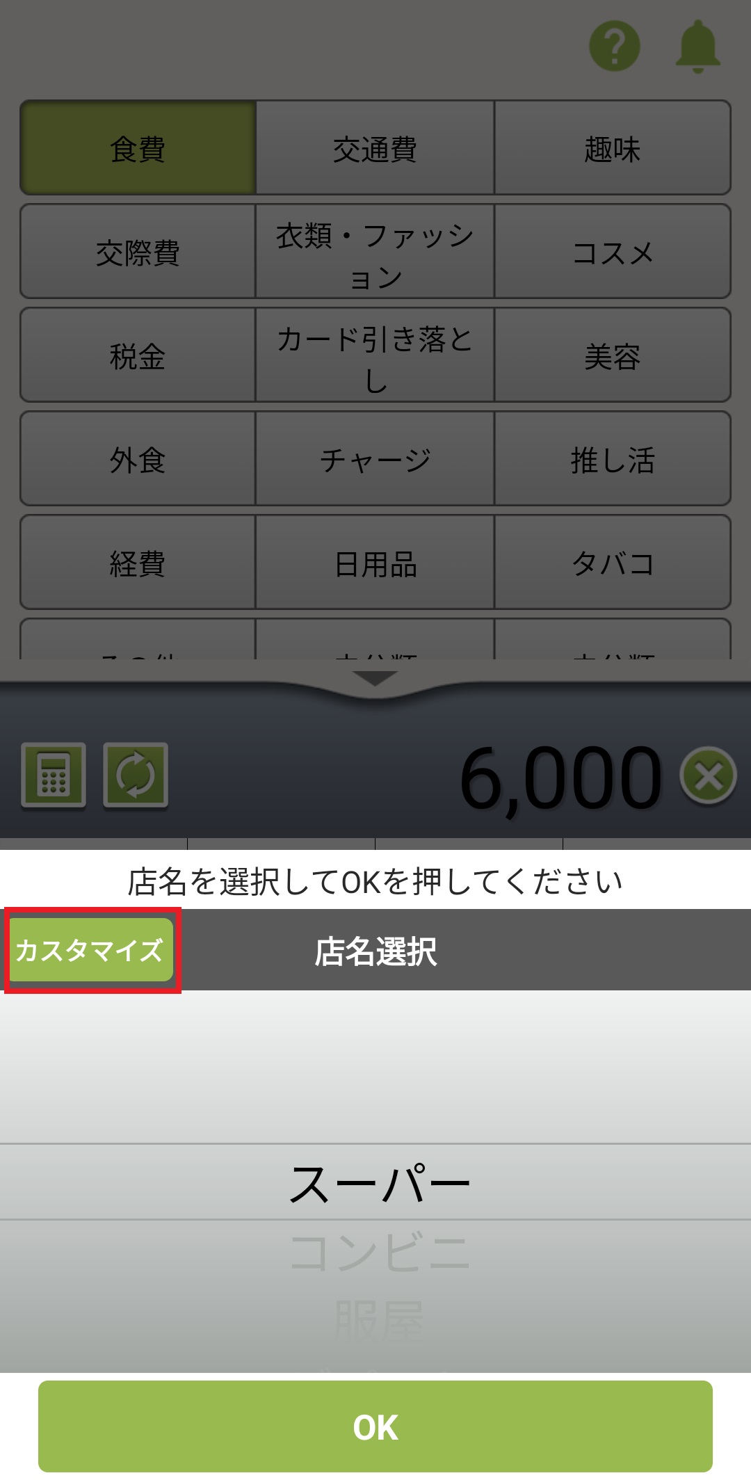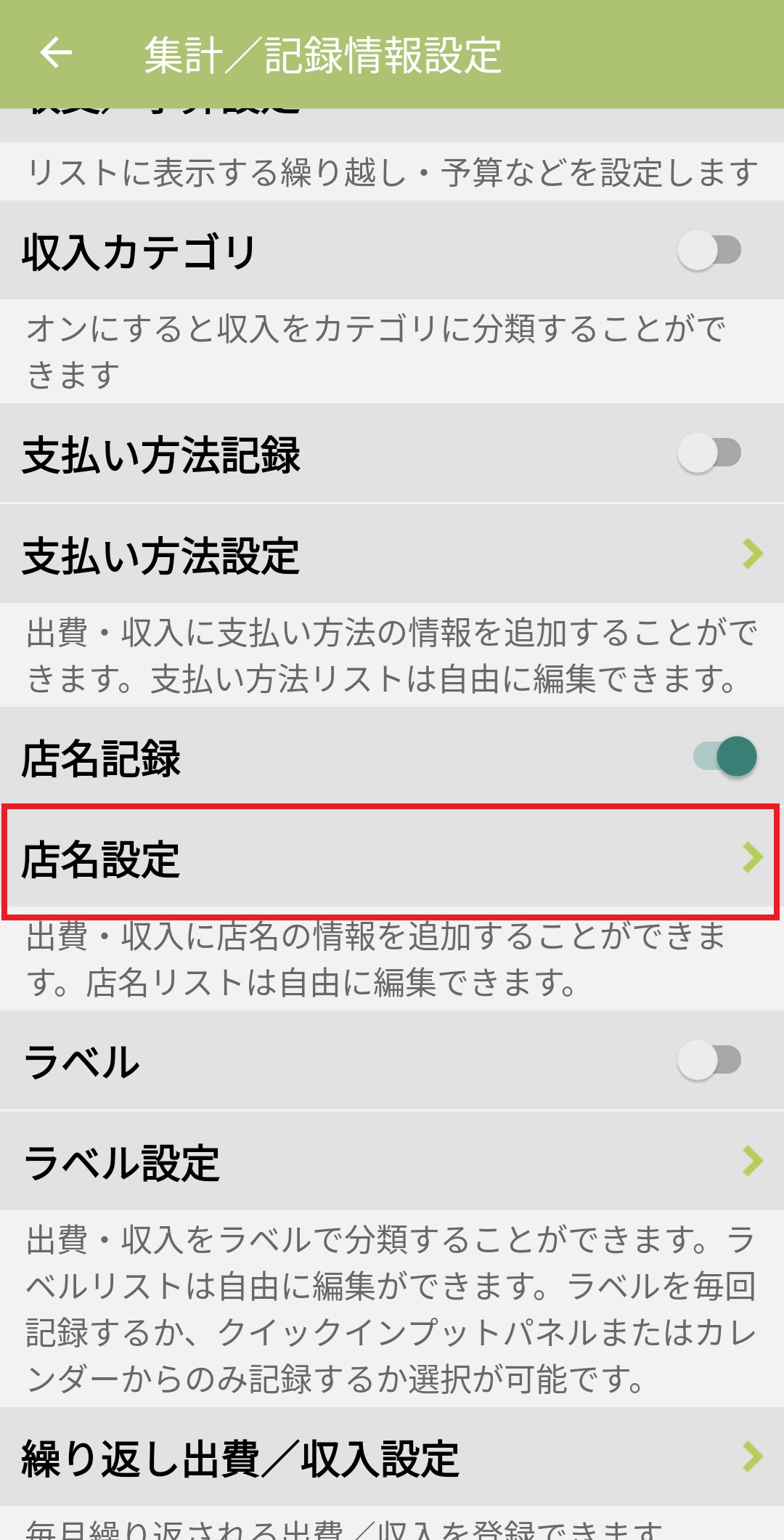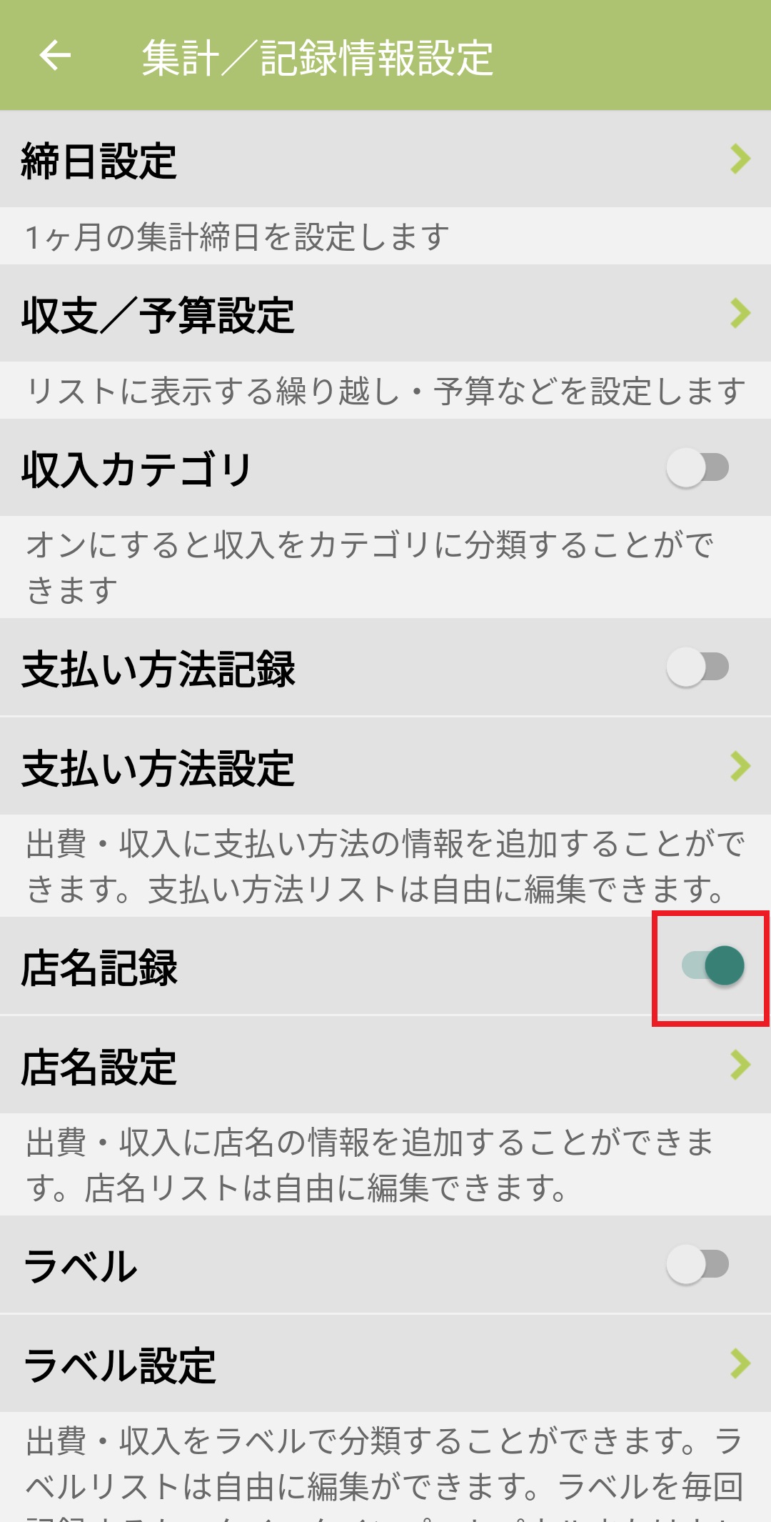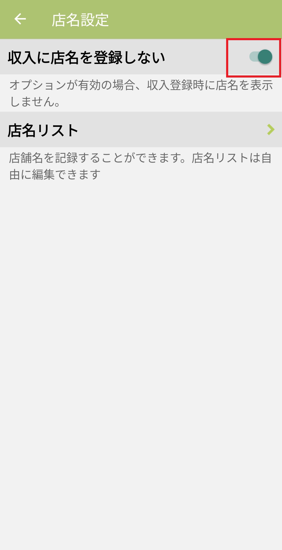 ※収入登録時に「店名」を表示させない場合は、上記手順3の項目の下にある「店名設定」を押し、「収入に店名を登録しない」をオンにしてください。